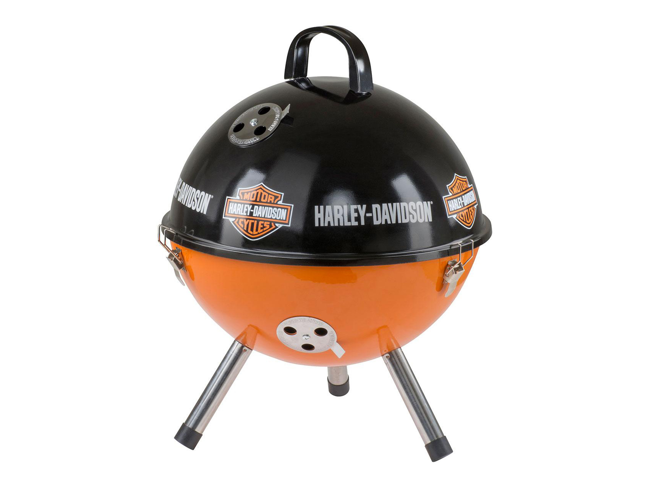 Tragbarer Holzkohlegrill mit schwarzem Deckel und orangefarbener Basis. Harley-Davidson- und Bar-&-Shield-Logo rund um den Rand des Deckels. Speziell geprägtes Harley-Davidson-Logo auf der Lüftungsabdeckung. Hitzebeständige Emaillebeschichtung bis zu 800 °F / 426 °C. Nur für die Verwendung mit Holzkohle geeignet.