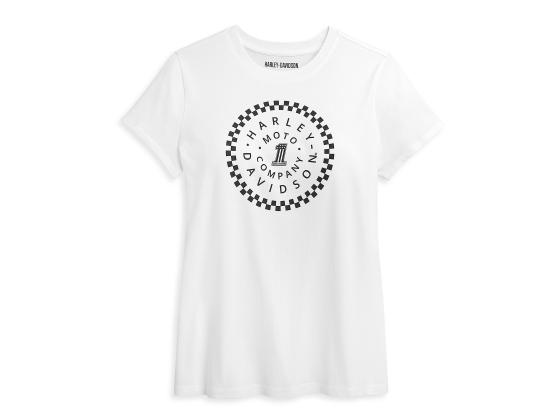 Harley-Davidson #1 Circle Graphic T-Shirt für Damen. Eine überaus gelungene Variante eines einfachen weißen T-Shirts. Diese traditionell geschnittene Shirt ist aus weichem reinem Baumwoll-Jersey gefertigt und hat einen gerippten Halsausschnitt. Es trägt ein aufgepepptes Design rund um unser #1 Logo aus dem Jahr 1969. Materialien: Jersey aus 100 % Baumwolle.