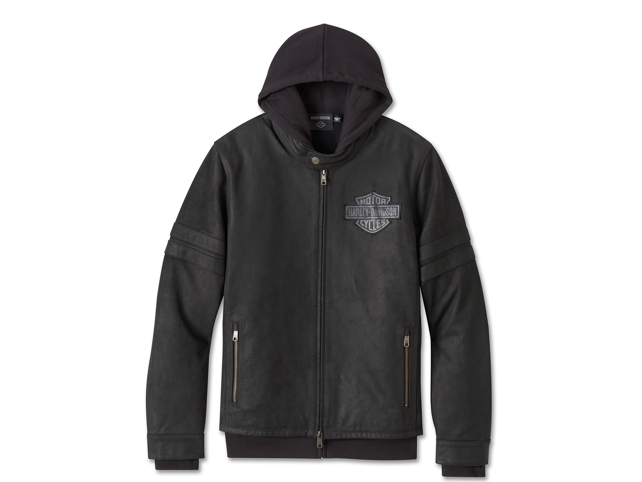 • Grafik: Bedruckter Lederaufnäher (Jacke). Gewebtes Markenetikett (Hoodie).