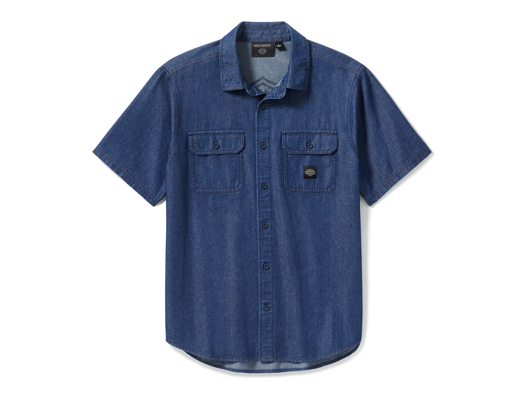 Wir haben diesem beliebten Klassiker ein H-D Upgrade verpasst. Unser Bar & Shield Chambray Shirt ist aus schwerem Baumwoll-Chambray gefertigt, um eine atmungsaktive, weiche Textur zu bieten, die sich leichter als Denim anfühlt. Dieses kurzärmelige Herrenhemd mit Knopfleiste hat einen verlängerten Saum, der sowohl in der Hose als auch darüber getragen toll aussieht, und einen verdeckten Druckknopfverschluss am Kragen, der auch unter Motorradbekleidung nicht flattert. Minimalistisches Branding mit unserem gewebten Label auf der Vorderseite, während unser beliebtestes Logo auf dem Rücken voll zur Geltung kommt.