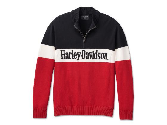 Mit dem Limited Edition Darting 1/4 Zip Sweater peppst Du die Weihnachtszeit mit einer Portion Harley-Stolz auf. Gefertigt aus einer kuscheligen Mischung aus Baumwolle und Wolle und mit seitlichen Rippstrick-Einsätzen und einem doppelten Stehkragen für einen gehobenen Look. Der auffällige Colorblock-Stil und das Intarsien-Strickmotiv verleihen diesem saisonalen Herren-Sweater den stilvollen letzten Schliff. Wenn Du ihn bald tragen möchtest, bestelle jetzt, denn die Stückzahlen sind begrenzt.