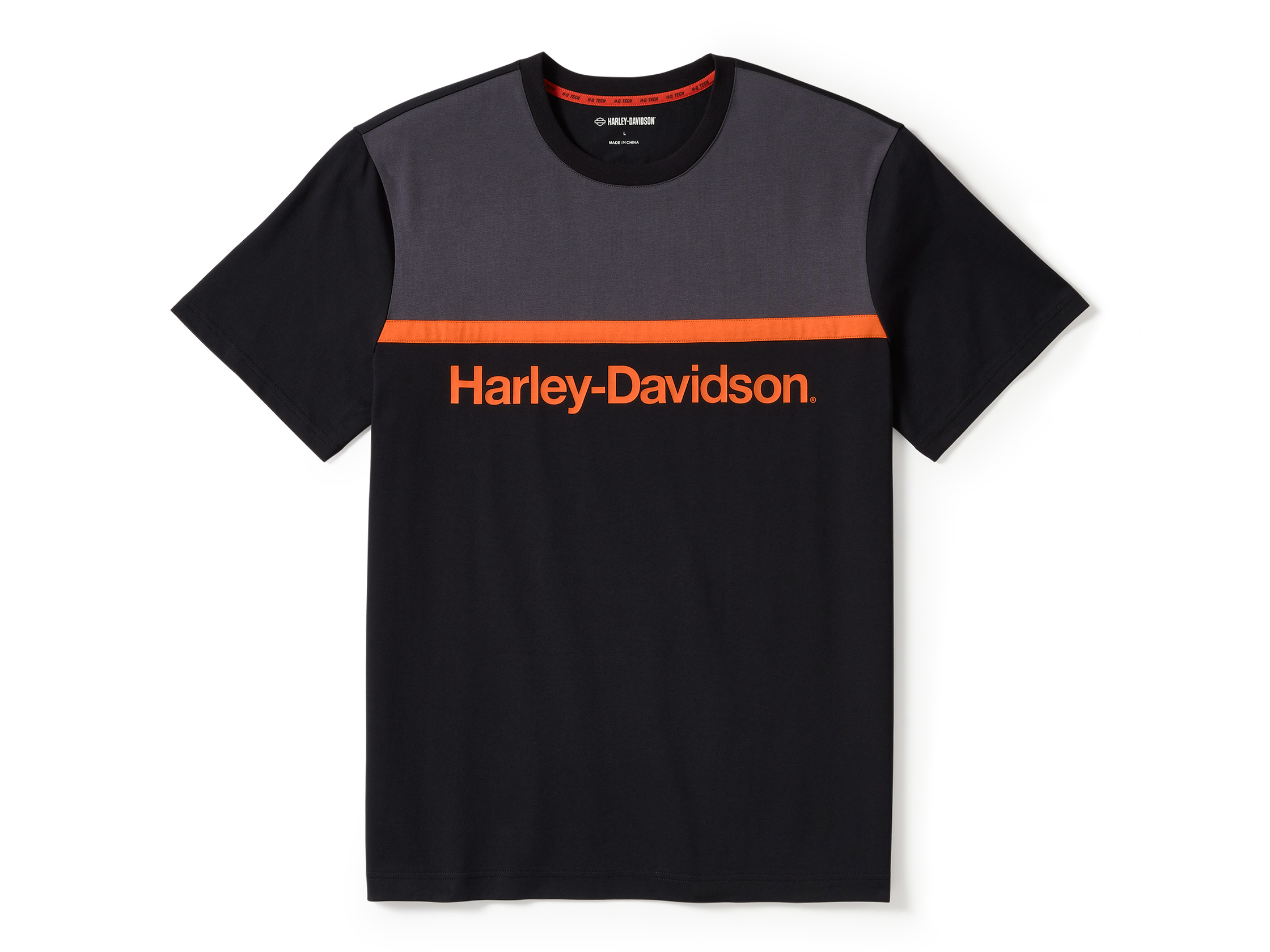 Für ein T-Shirt, das genauso gut aussieht wie es performt, gehört das H-D® TECH Coolmax® Kurzarm-T-Shirt in deine Kollektion. Hergestellt aus einem Coolmax® Baumwoll-/Polyester-Mix, der Feuchtigkeit ableitet, hilft es dir, Schweiß in Schach zu halten. Dieses Herren-T-Shirt überzeugt durch kontrastierende Einsätze und gebrandetes Stretch-Nackenband für einen hochwertigen Look sowie einen Rippstrick-Ausschnitt, der die Form behält. Der moderne H-D Style wird durch unsere ikonischen orangefarbenen Grafiken auf Vorder- und Rückseite unterstrichen.