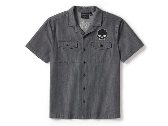 Das Willie G" Skull Denim Shirt kombiniert Tragekomfort mit legendärer Kunstfertigkeit. Gefertigt aus schwerem Twill aus genoppter Baumwolle, der für einen strukturierten Used-Look einer Stonewashed-Behandlung unterzogen wurde (zoome ran für einen besseren Blick). Dieses kurzärmelige Button-Down-Hemd für Herren in weitem Mechaniker-Schnitt ist mit einem mutigen Willie G Skull Motiv versehen. Kleine Geschichtslektion: Obwohl der Skull eine seiner bekanntesten Kreationen ist, hat der legendäre Designer Willie G. Davidson auch mehrere Motorräder entworfen, darunter die 1971er FX Super Glide® und die 1977er FXS Low Rider®.