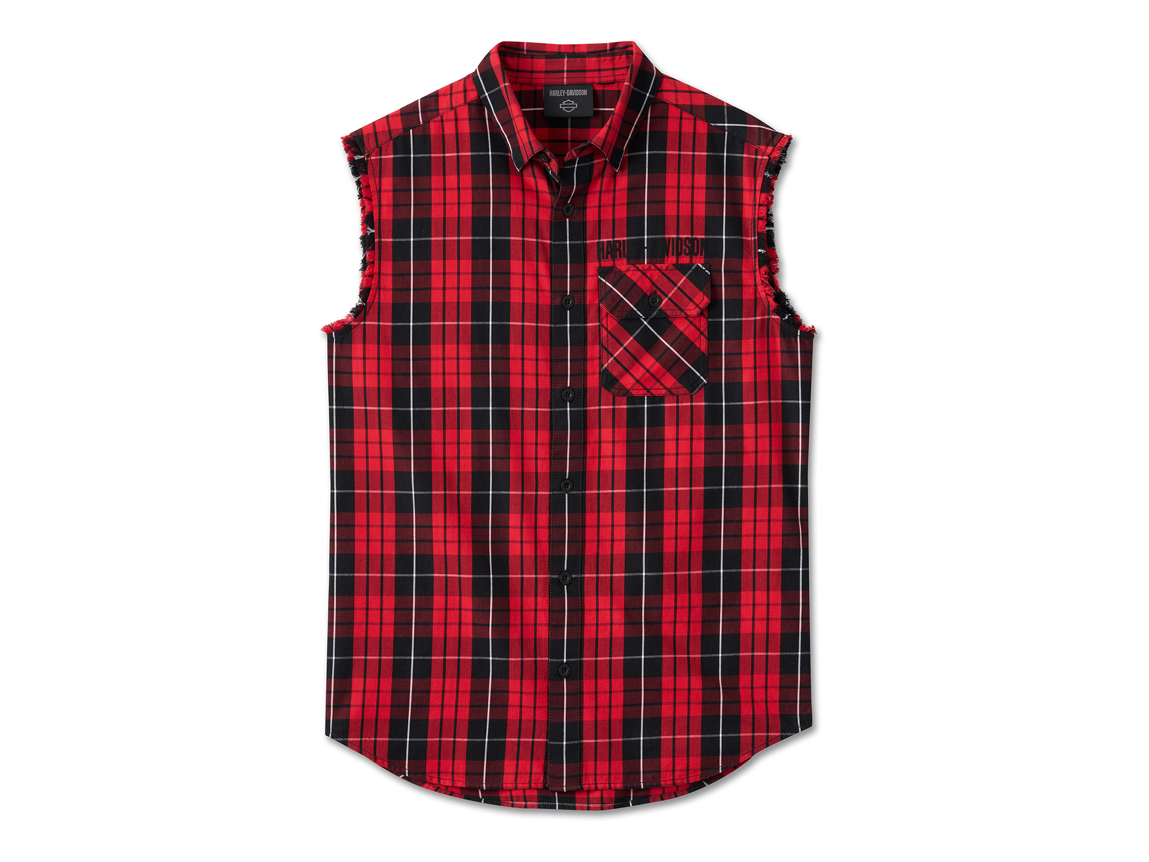 Ein feuriges Karomuster wird bei unserem Ultrahot Blowout für H-D Enthusiasten neu interpretiert. Dieses ärmellose Button-Down-Hemd für herren verfügt über Fransen an den Armöffnungen und einen Kragen mit versteckten Druckknöpfen, der beim Fahren an seinem Platz bleibt. Es ist in entspannter Passform aus leichtem Twill aus Baumwolle gefertigt, der weich gewaschen wurde. Wir haben diese klassische Biker-Silhouette mit unseren aufgedruckten Motiven auf der Vorder- und Rückseite veredelt.