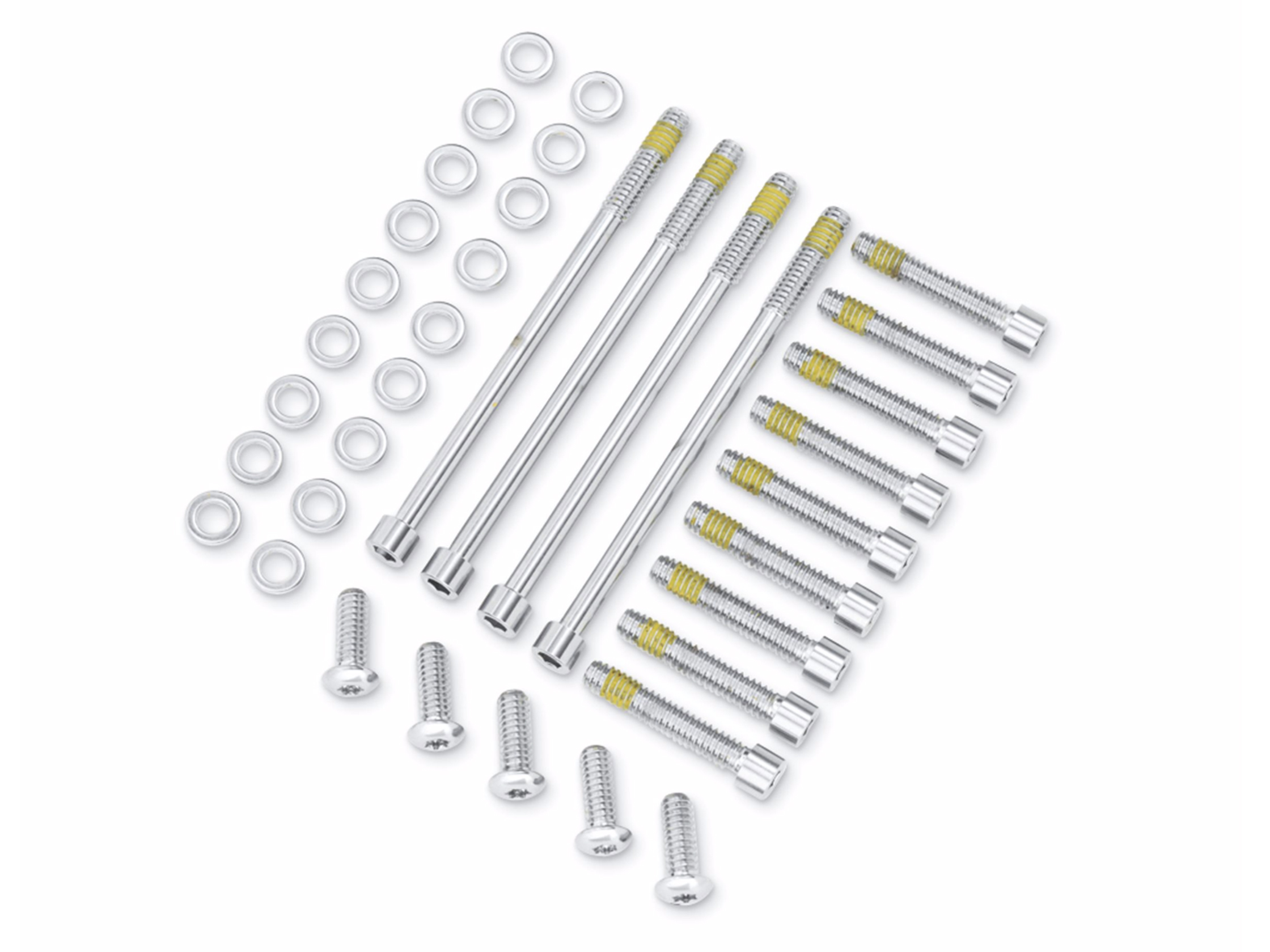 Beinhaltet alles, was zum Austausch der sichtbaren verzinkten Befestigungselemente am äußeren Primärantriebsdeckel benötigt wird. Auch für Inspektionsdeckel und Derby Deckel sind die Befestigungsteile enthalten. Mit Schraubensicherung, wo erforderlich.