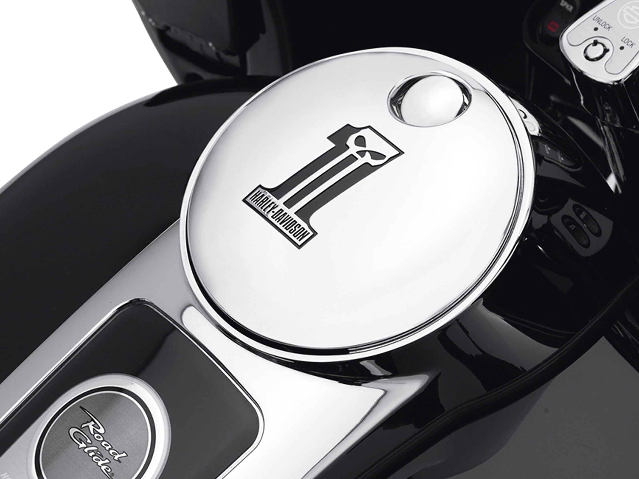 Das finster aussehende Harley-Davidson Number One Skull Logo verleiht Ihrem Bike den richtigen Vorzeige-Look. Die Teile dieser Kollektion sind aus Aluminiumdruckguss gefertigt. Sie wurden poliert und verchromt, um ihnen einen brillanten Glanz zu verleihen, während das Logo mit schwarz ausgefülltem Dark Custom" Schädel für einen attraktiven Kontrast sorgt. Die leicht zu montierende Klappe ersetzt die originale Tankklappe und wird mit dem originalen Montagesatz und Verriegelung angebracht.