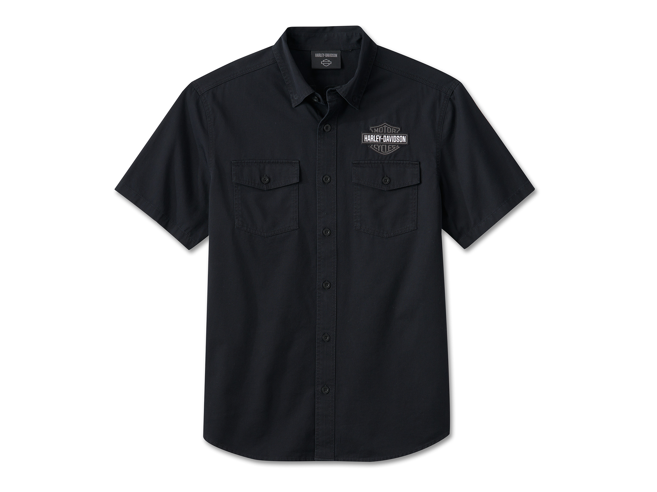 Tucked or untucked, your fit is timeless in our Ashes Short Sleeve Shirt. It's crafted from lightweight cotton twill for breathable comfort that's stone washed for a well-worn vibe. This men's button down delivers a relaxed fit and features a hidden snap-down collar that won't flap around under riding gear. Finished with embroidered branding on front and a matte satin appliqué on back for an elevated Harley-Davidson look.