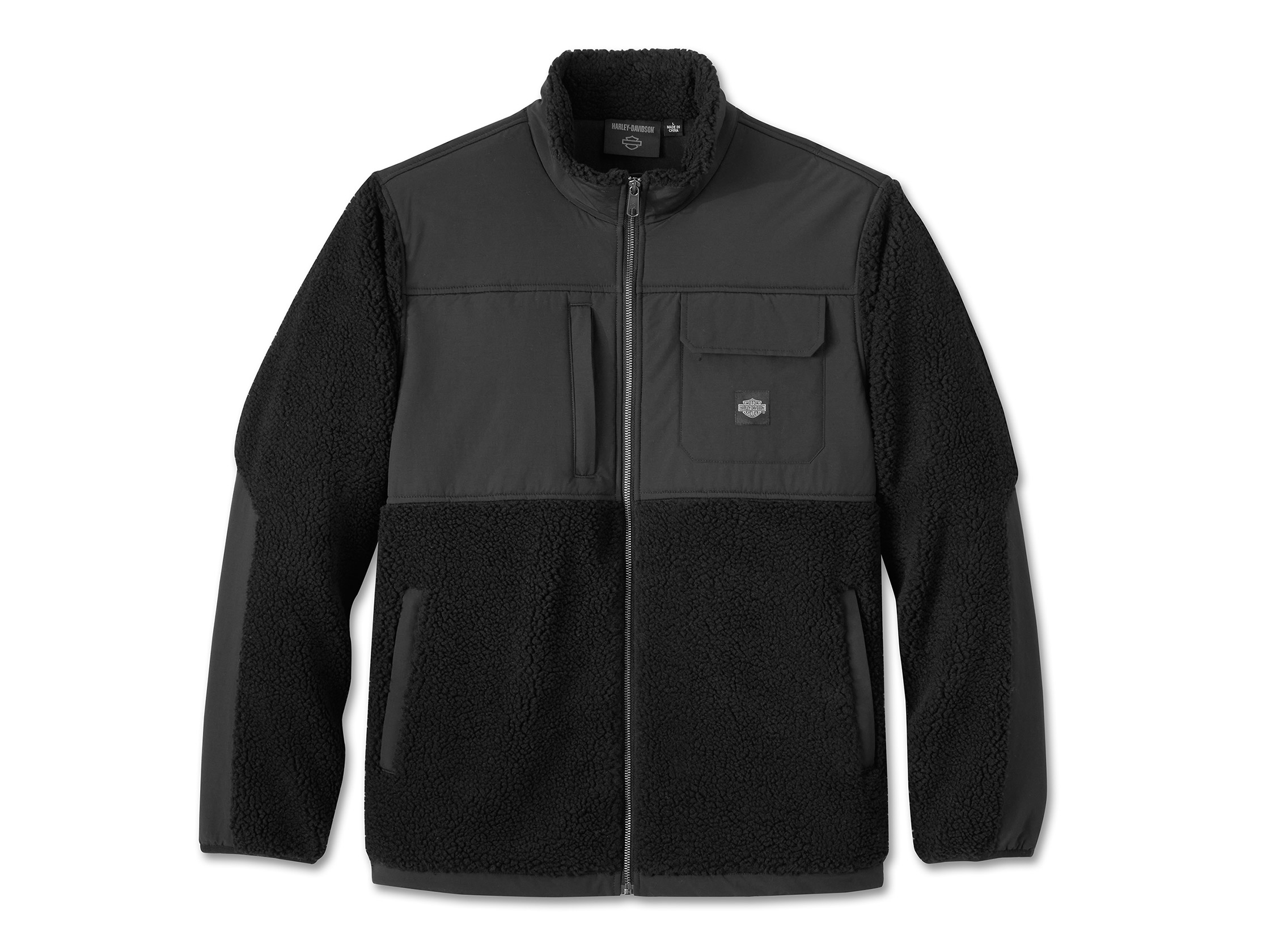 Cozy winter style gets an enthusiast upgrade on our Limited-Edition Harley-Davidson® Sherpa Full Zip. This men's outerwear jacket is cut from heavyweight Sherpa with nylon/cotton piecing plus a soft jersey lining. It features a stand collar, elastic knit cuffs, and an adjustable toggle-cord waist to keep you warmer in chilly weather. It has ample pocket space for securing essentials and is branded for a more understated look. Snag yours while supplies last.