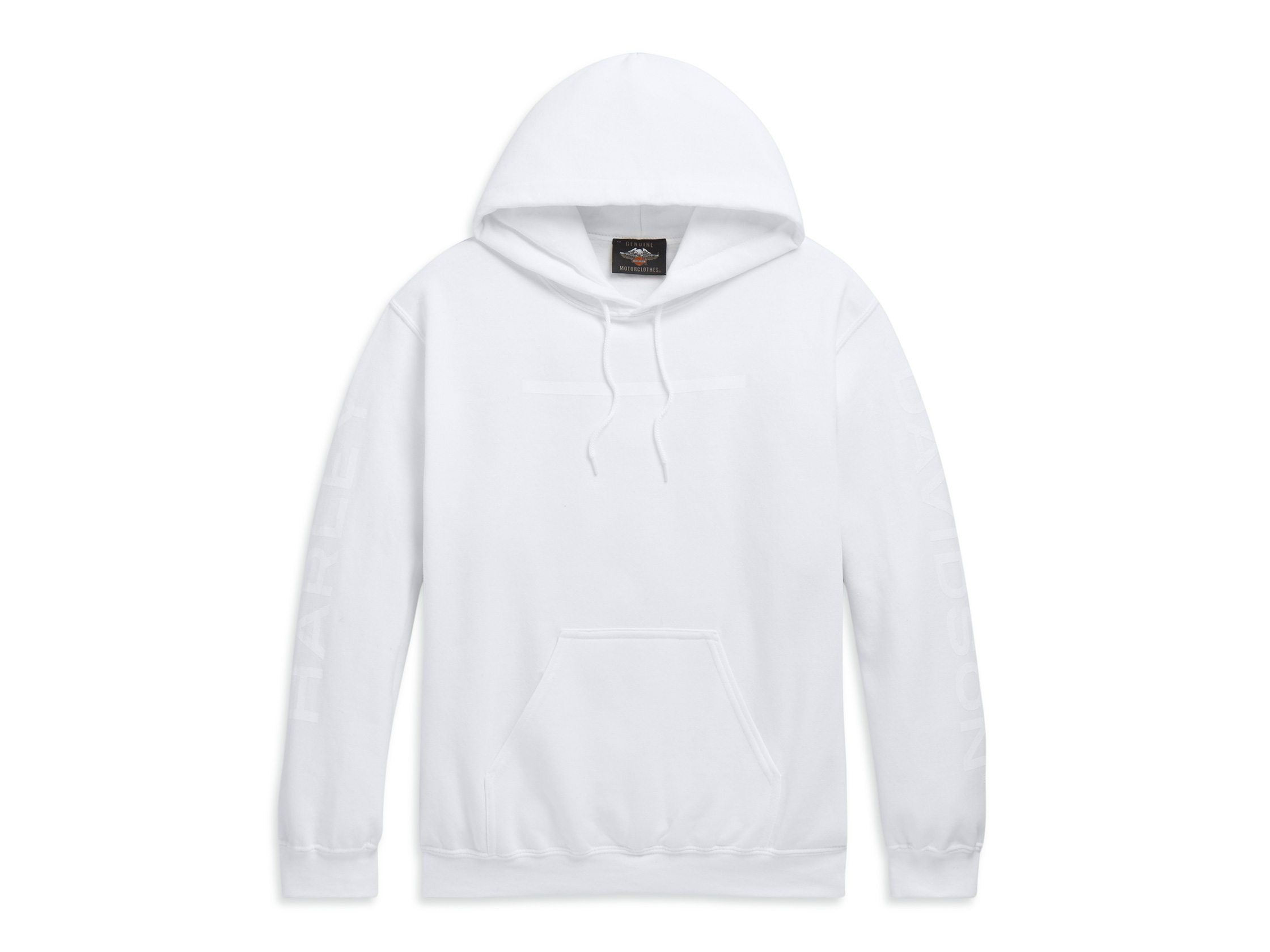 The Hyphen Pullover Hooded Sweatshirt for men gives special attention to the understated punctuation that divides our company name. By placing a founder's name on each sleeve, the hyphen becomes a sleek, modern graphic element all its own on the front. Built from soft, warm white cotton/poly, this men's hoodie is styled with all the classic details: kangaroo pocket, rib-knit trim, and a hearty drawstring hood. Tonal printed graphics inject a stealthy, low-key vibe. Materials: 50% Cotton, 50% Polyester