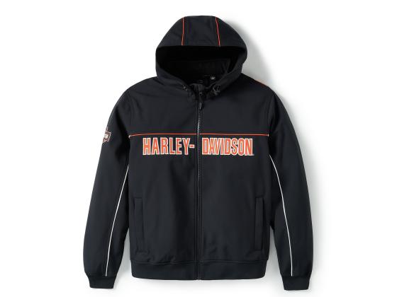 Stay comfortable and true to Harley style in our latest Idyll Windproof Soft Shell Jacket. Made with water-repellent and windproof materials, it's an ideal men's outerwear pick for when the weather won't cooperate. It also features zip-closed pockets for securing essentials, a removable hood with toggle cord, and a stretch rib action back. Finished with contrast piping and embroidered graphics for classic-meets-modern look. Order yours while supplies last.