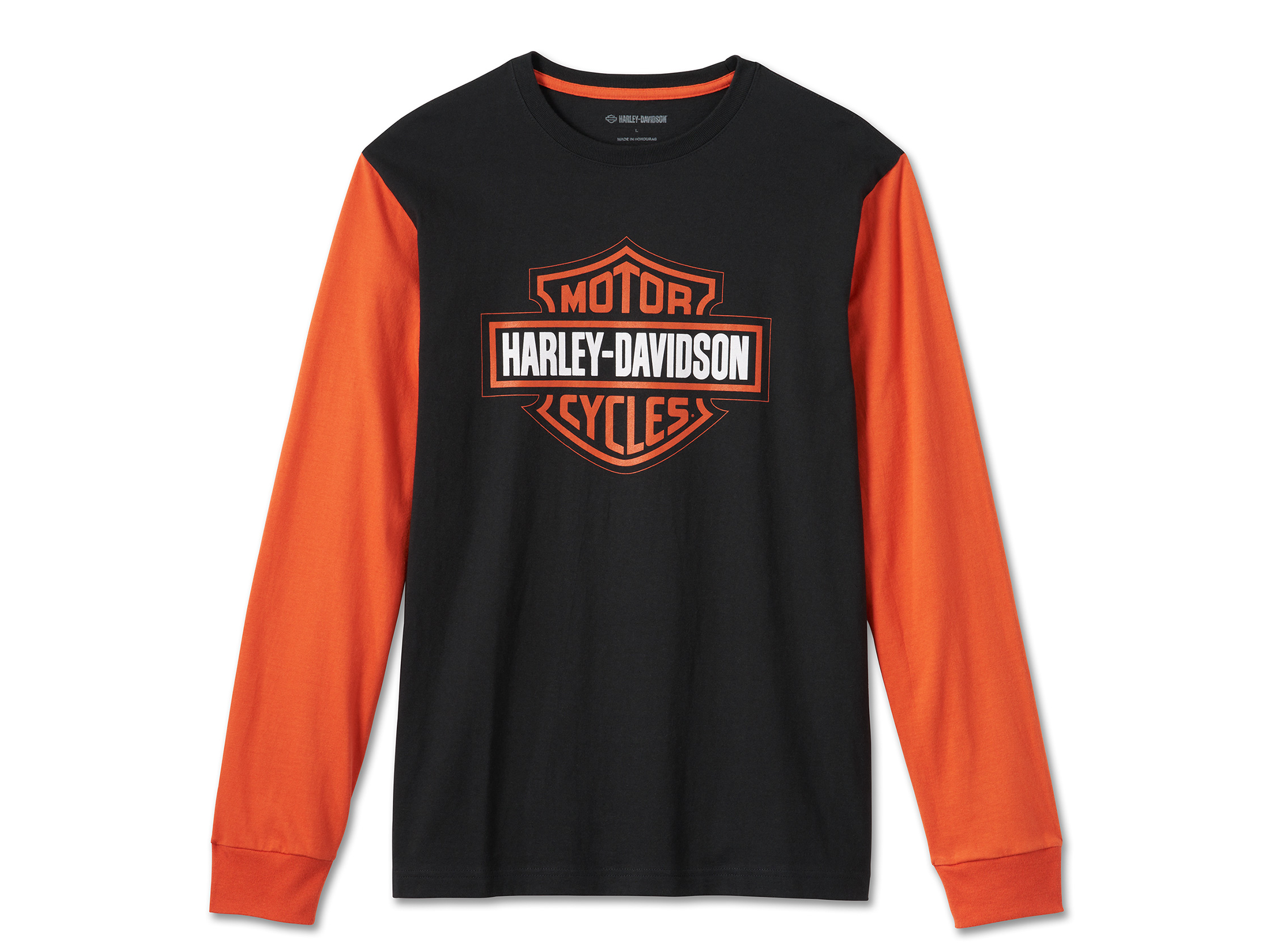 The Bar & Shield logo has never looked better. This 100% cotton jersey long sleeve tee screams Harley-Davidson. From the bright orange contrasting sleeves to the printed signature graphics, you'll be bummed if you miss out on adding it your wardrobe.