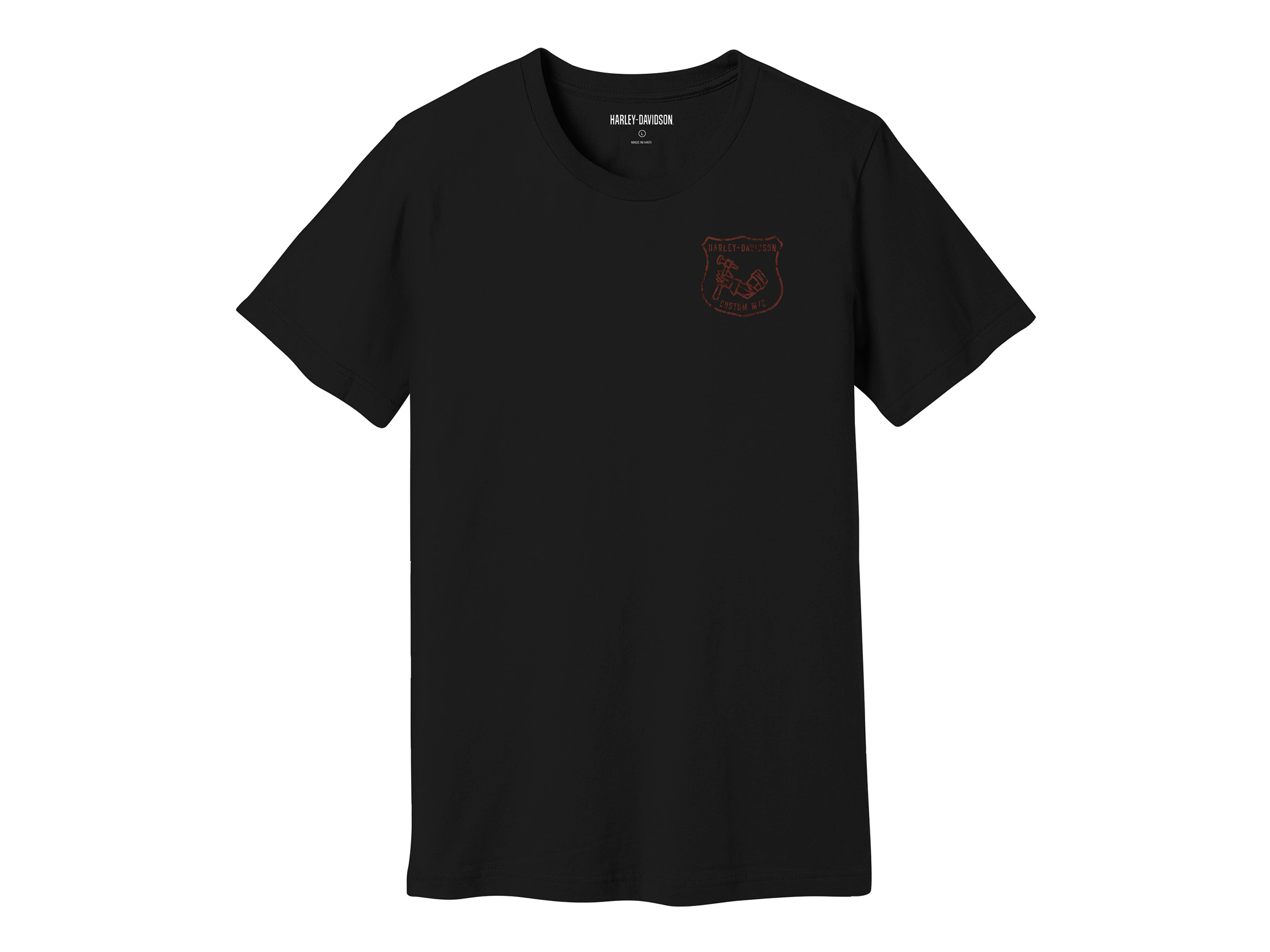 Retro-inspired style comes to life on our Iron Bond Tee. Available in a traditional and slim fit custom silhouette, this men's t-Shirt is made from 100% cotton jersey so you can bank on comfort 24/7. Finished front and back with a genuine design that pays tribute to the mechanics behind our rich motorcycling legacy.