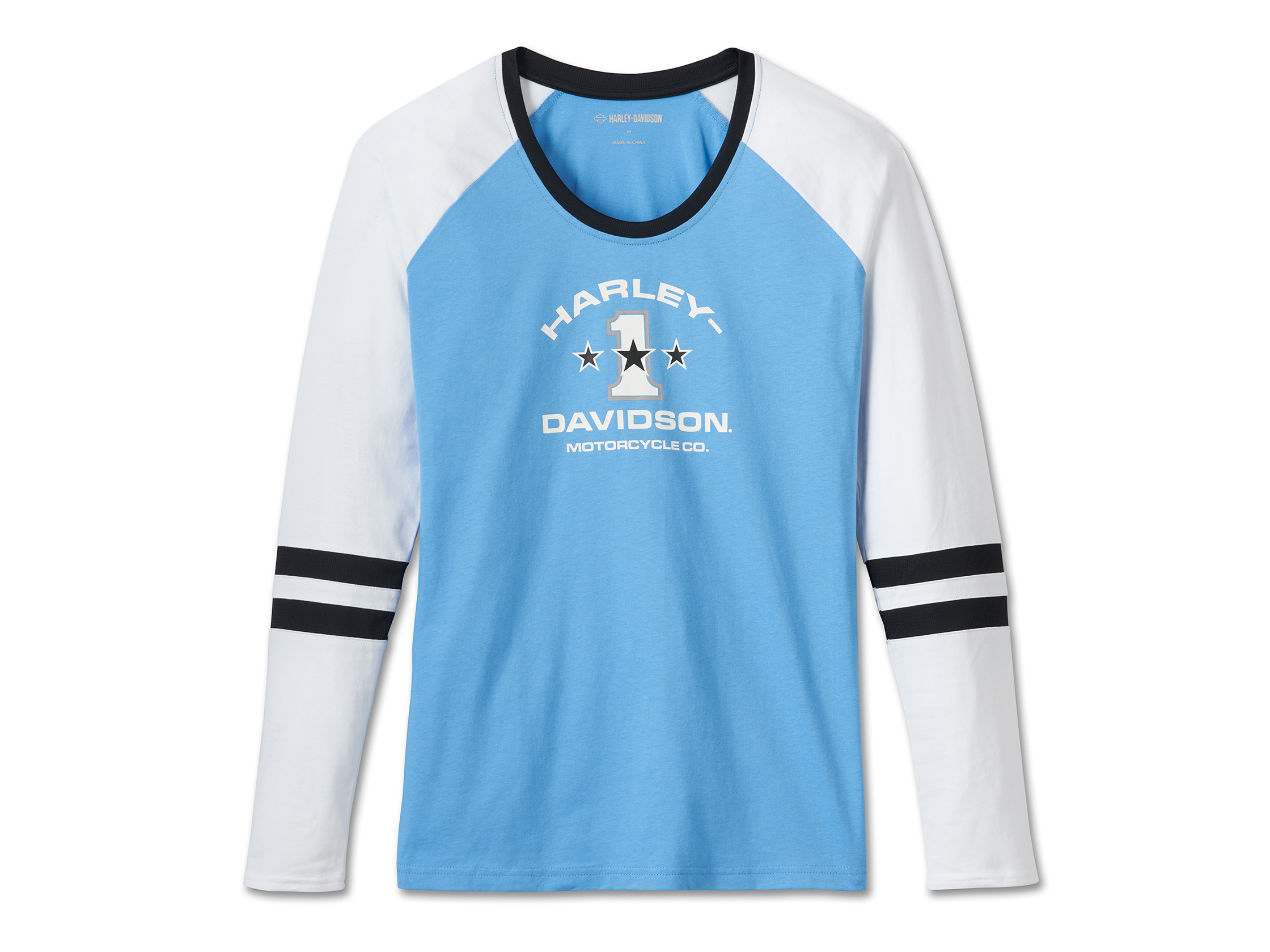 Comfort rides along with sporty style on this limited edition. Made from breathable cotton jersey, our women's First-Class Long Sleeve Raglan Top features a polyester mesh scoop neckline and sleeve striping. Its elevated, contrasting look is finished with graphics inspired by our successful racing legacy. In fact, the #1 featured here resembles our original #1 Logo that was created in 1969 to celebrate our AMA Grand National Championship season title.