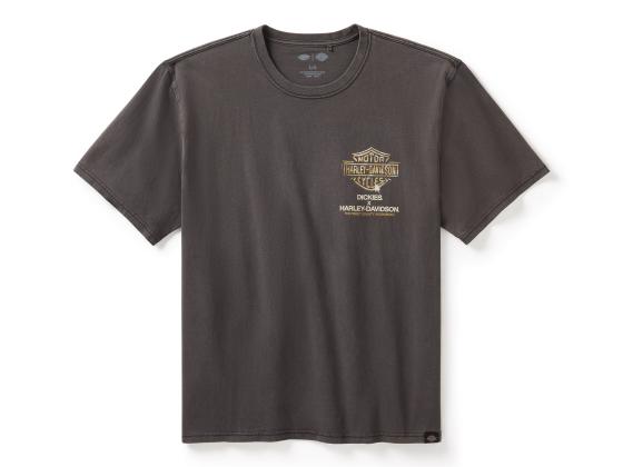 A perfect blend of bold style and longwearing comfort is here on the Dickies® x H-D® Heavyweight Flaming Eagle Tee. Made sturdy from heavyweight cotton jersey in a relaxed fit that's heavy pigment washed to give it a unique color and shading variation, as well as a well-worn look and feel. The eye-catching artwork on back showcases two branding staples with the eagle for Harley-Davidson and the Dickies horseshoe. Part of the Dickies® x H-D® Collaboration—special-edition apparel that merges iconic workwear with iconic motorcycle culture.