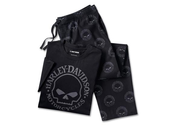 Stay-cozy style honors a creative legacy in the Limited-Edition Willie G Skull Short Sleeve Pajama Set. The top is made from breathable cotton jersey with a rib-knit neckline to help keep its shape. The bottoms are a cozy cut of cotton flannel with a drawstring waist and side seam pockets. These men's pajamas are finished with an allover custom pattern of the beloved Willie G Skull on the bottoms and filling the front top. Know the history—in addition to creating iconic brand graphics, Willie G. personally designed several motorcycles, including the 1971 FX Super Glide and the 1977 FXS Low Rider. Order now while supplies last.