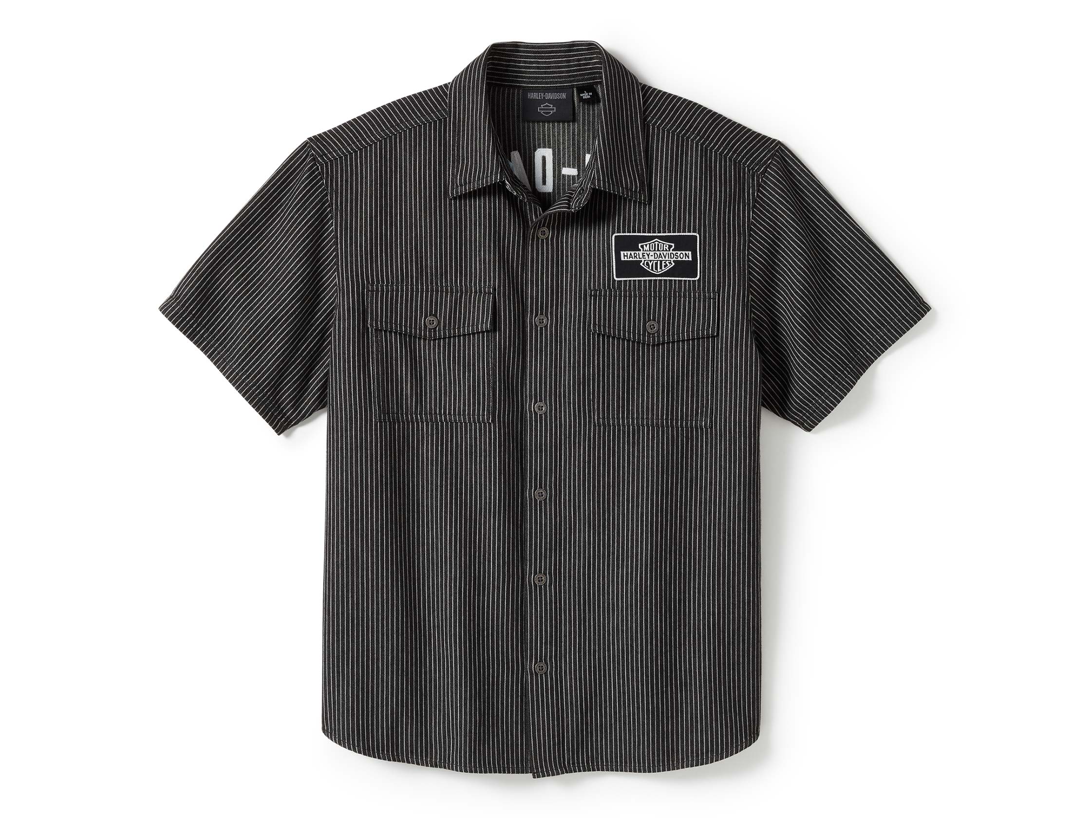 Throwback style goes all in on our V-Twin Equipped Striped Mechanics Shirt. Crafted for longwearing comfort from rugged yet breathable cotton twill that's hickory striped and stone washed for a vintage vibe. This men's short sleeve button down has a slightly shorter and roomier mechanic silhouette, and features a hidden snap-down collar that stays put under riding gear. It's finely finished with embroidered and chainstitched graphics. In fact, the canvas patch on front mimics our circa 1920s Bar & Shield.