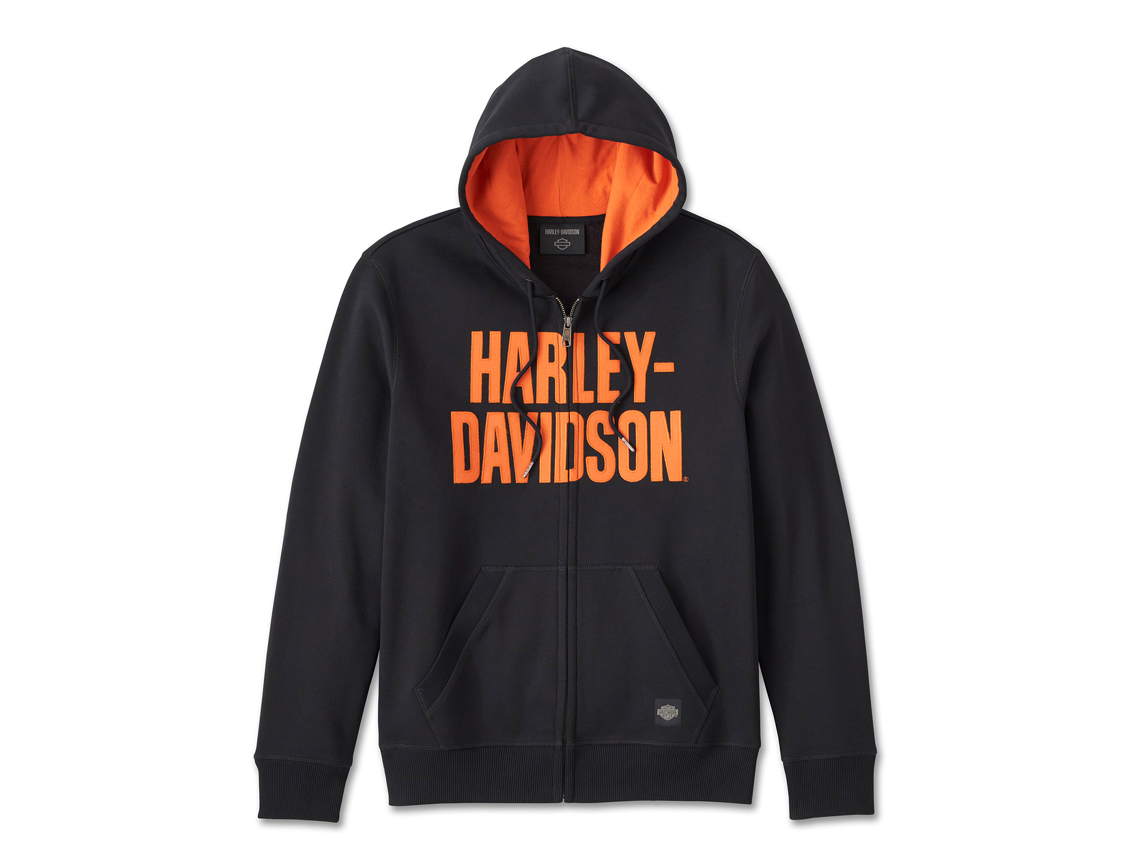 For casual comfort and elevated H-D® style, our Bar Font Zip-Up Hoodie does not disappoint. Its relaxed fit is constructed from cozy cotton/polyester fleece. This men's zip front hoodie gets its next-level looks from a contrast jersey hood lining that synchs with our bold appliqué branding.