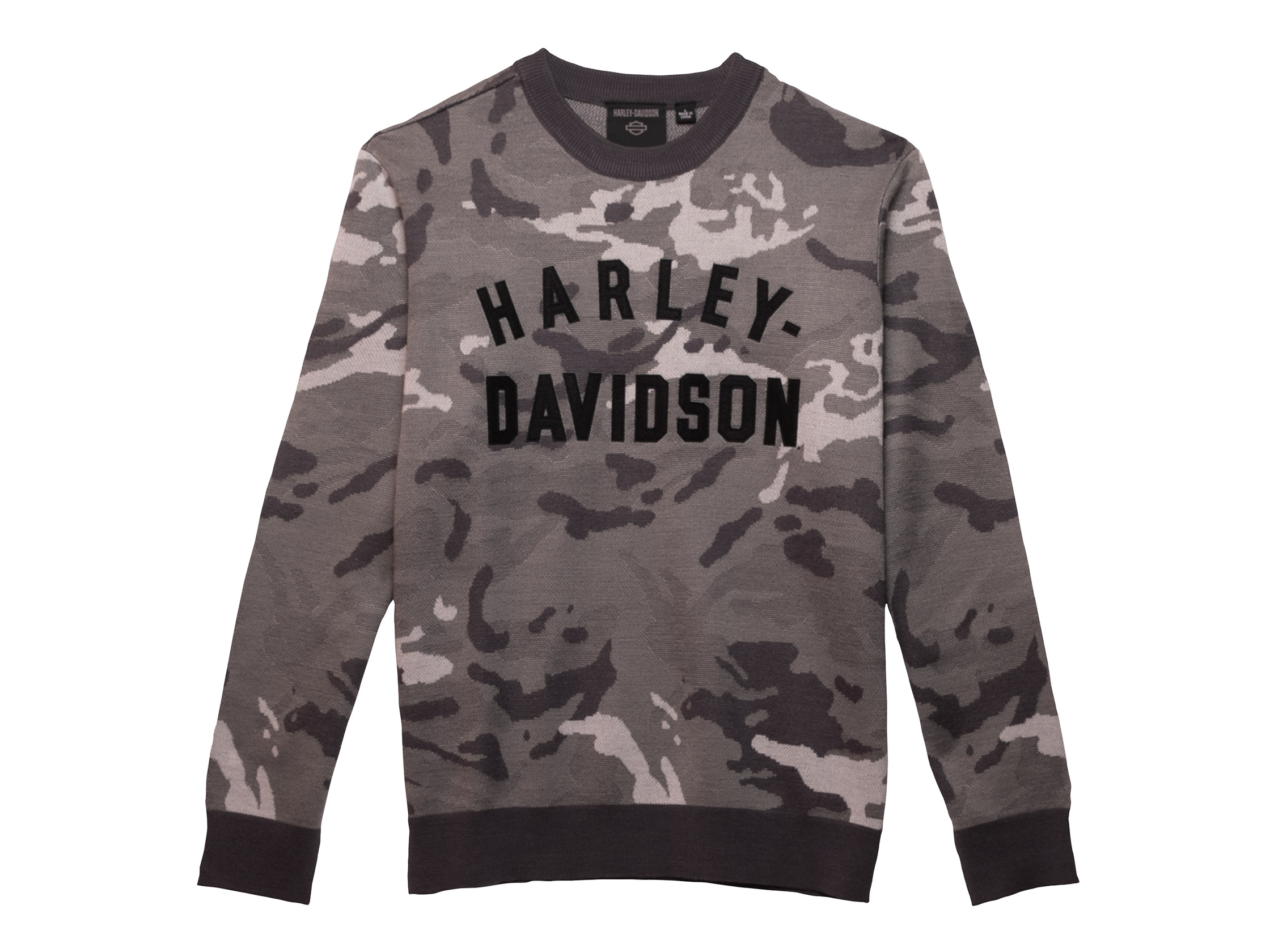Materials: 70% acrylic, 30% wool intarsia. Design details: allover camo knit pattern. Rib-knit neckline, cuffs and hem.