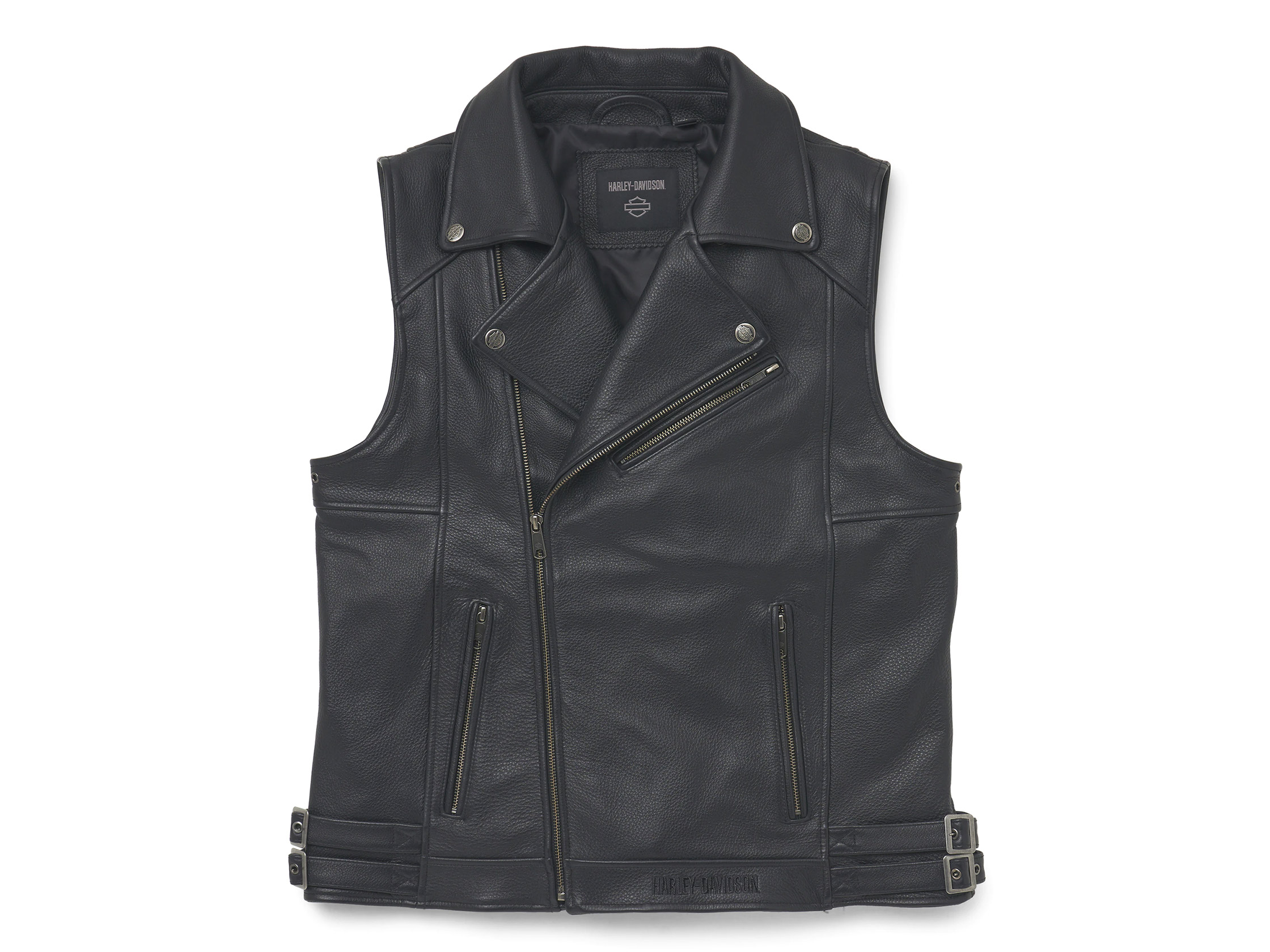 Snaps, buckles, and grommets seamlessly come together for an authentic rider style in the Layton Leather Vest. Fully lined and crafted from a generous cut of cowhide—one of the thickest leathers that's waterproof and tear-resistant. Features durable, zip-close pockets and adjustable leather belts with metal buckles along the waistband. We kept the branding low-key so you can amp it up with all of your favorite H-D® layers underneath.