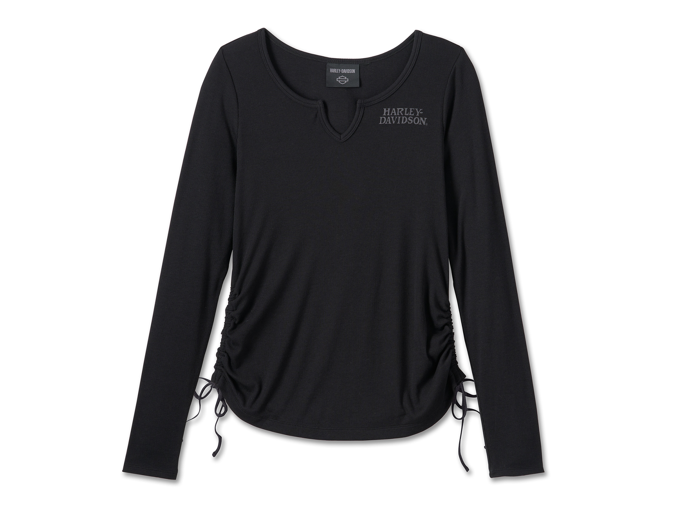 Elevated, casual style meets comfort in our Willie G Skull Tie Notch Neck Knit Top. This long sleeve top is made from a lightweight cotton/modal/spandex rib blend with flattering features like side-seam ruching, a notched neckline, and a rounded hem. Our namesake is perched on front, while the back boldly displays our esteemed Willie G Skull—this circa 2000 Daytona Bike Week graphic is still a rider favorite.