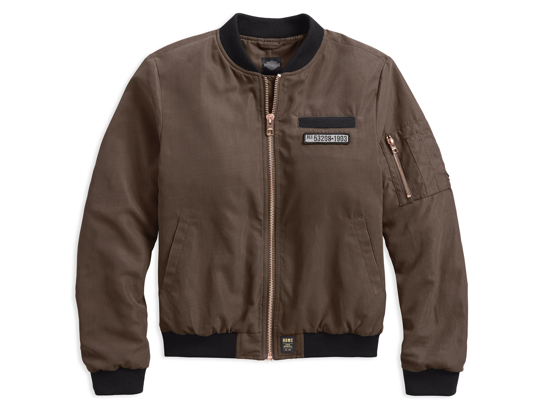 85% polyester, 15% nylon peached satin. Rib-knit collar, cuffs and hem. Zippered front. One chest pocket. Two hand-warmer pockets. Gathered seams on back of sleeve. Zippered pocket and pencil holder on left sleeve. Embroidered patch below chest pocket. Leather patch on hem.