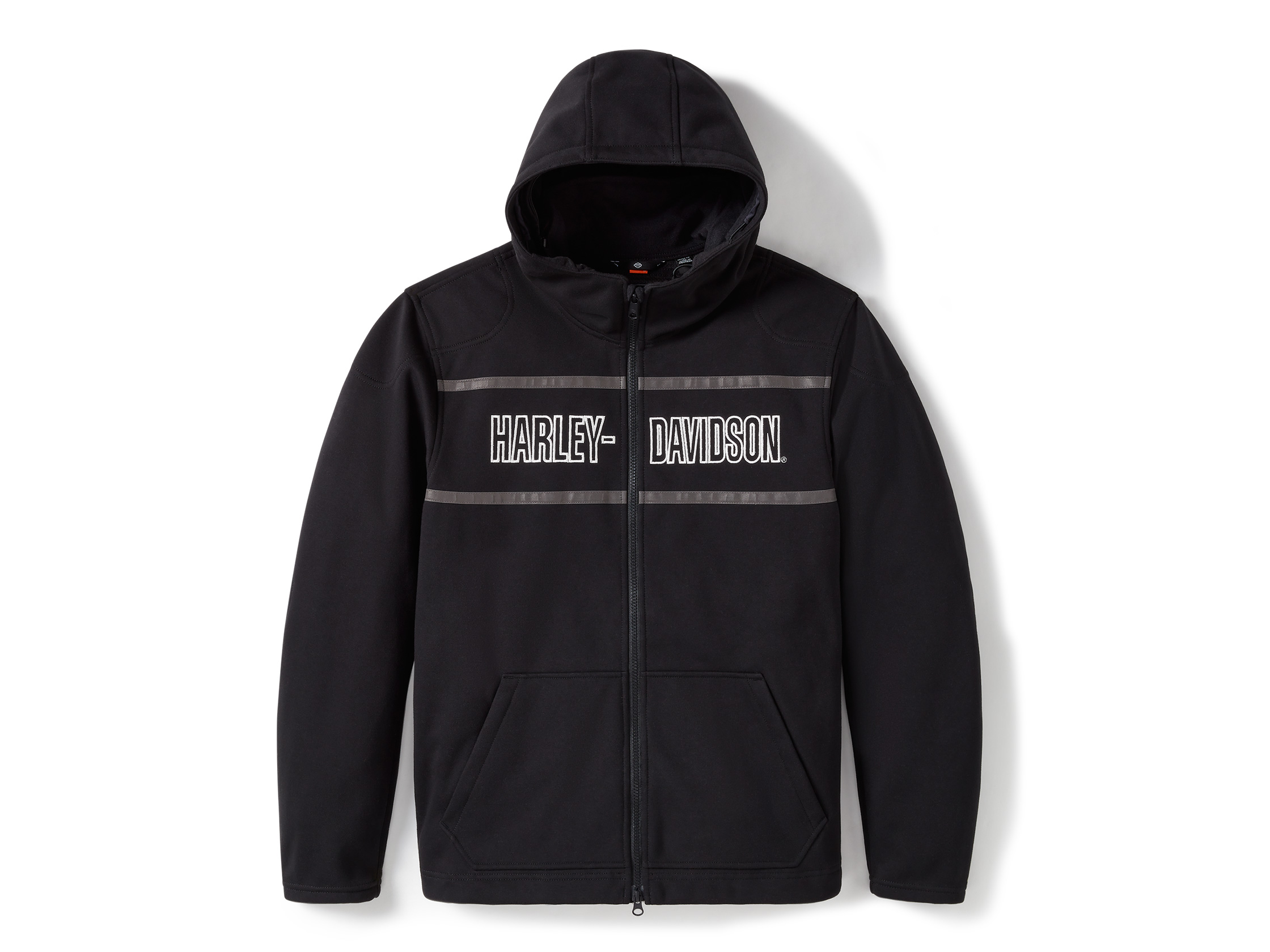 Enduring casual style merges with functional riding protection in our H-D® Trenton Deflector 2.0 Hooded Riding Fleece. This latest men's motorcycle jacket is tested and certified to meet abrasion, tear, and seam strength requirements. It wisely includes impact protection with our D3O® Ghost" armor at the shoulders and elbows. We've also extended the venting area to welcome more airflow, included reflective material to enhance visibility, and added a secure zippered pocket to the right kangaroo pocket. Made from a heavyweight bonded material with a breathable mesh lining, it's engineered to be windproof and features an adjustable toggle-cord hood that zips down to reduce drag while riding. It's finished with contrast piecing and our embroidered branding for a more modern, road-inspired look. See more of its specs below, then order yours while supplies last.