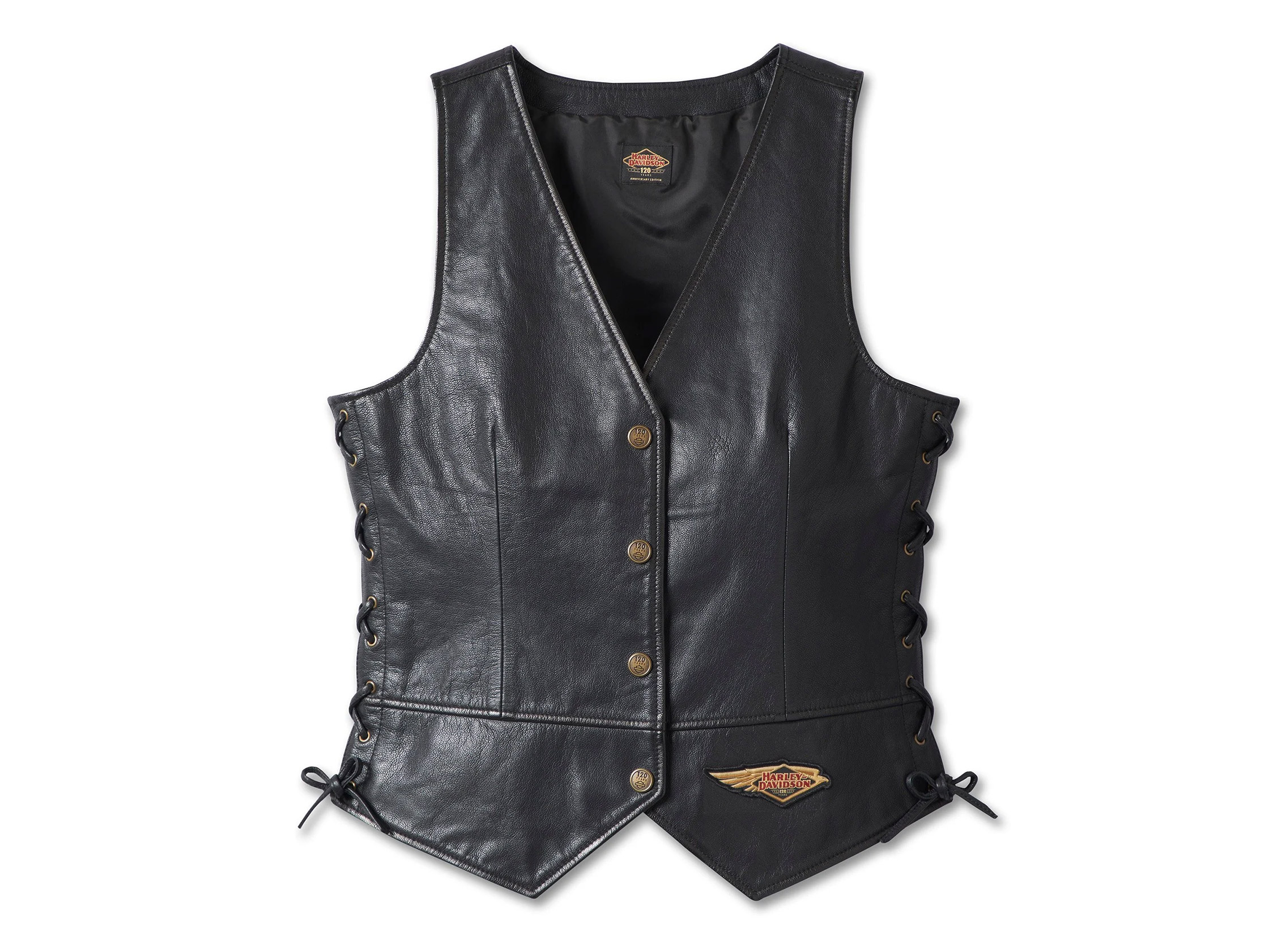 Leather, lace, legendary—all of that's covered in this commemoratively stylish women's vest. Its midweight goatskin build features leather corded side seams and a split back hem. This 120th Anniversary Laced Side Leather Vest is decked out with special touches that honor our heritage like custom hardware, labeling, and our signature Anniversary branding that graces the front and goes all-in on back.
