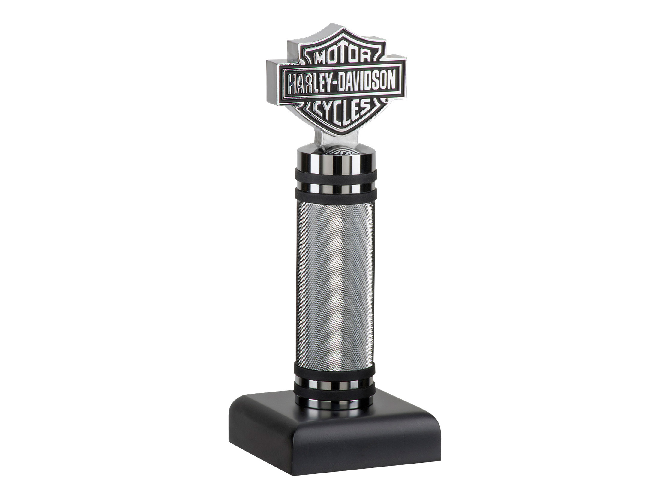 Custom tooled metal tap handle is modeled after your favorite hand grip. Features silicone accent grips and Bar & Shield topper. Fits most dispensers or looks great displayed on its wood base (included).