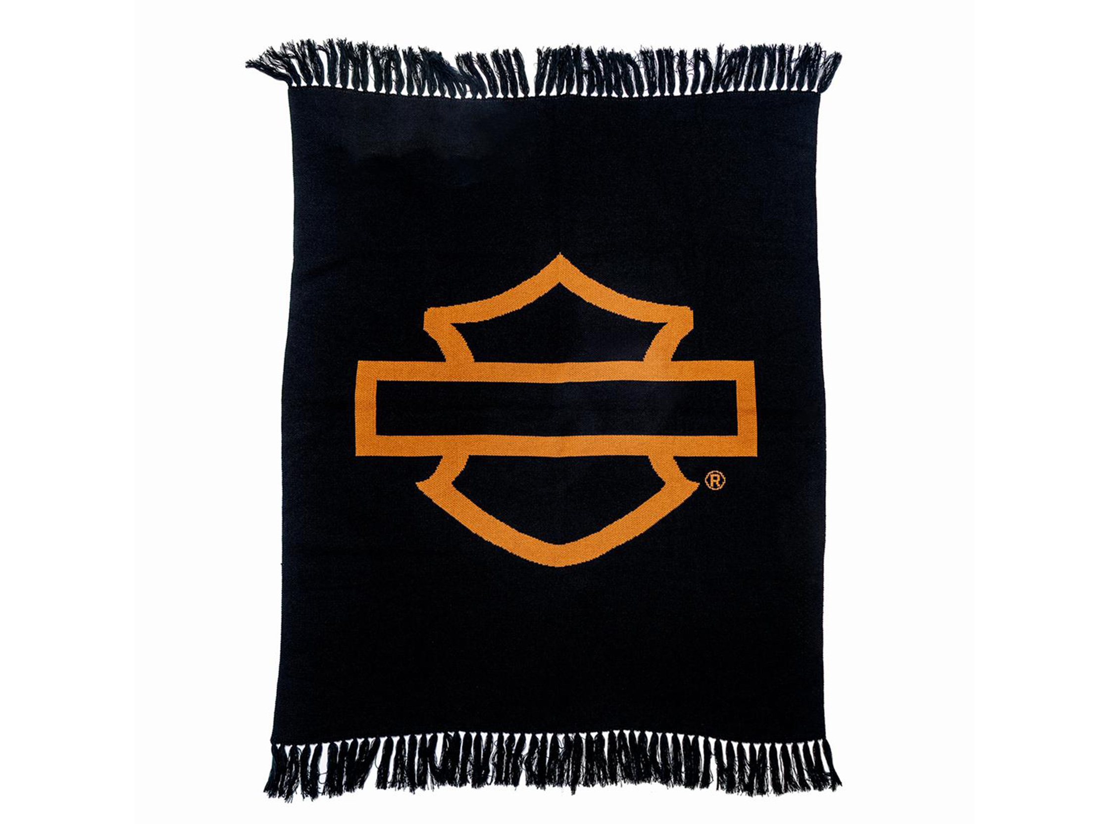 Comfy black and copper knit blanket with woven Open Bar & Shield logo. Dimensions: 127 x 152 cm