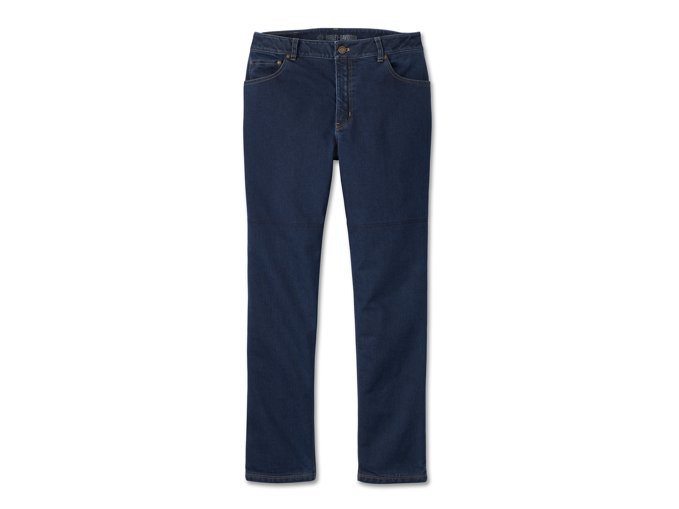 Classic denim style meets impact protection in our latest riding pants. Made abrasion-resistant from a heavyweight material blend, our Harley-Davidson Straight Riding Denim delivers a slimmer fit through the hip and thigh with traditional five-pocket jean styling. The D30 Ghost armor at the hips and knees plus reflective material to boost visibility make these men's motorcycling pants a sensible choice for riding. The branding stays clean so you can pair them with any H-D riding jacket or shirt you own.