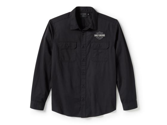 Lowkey meets legendary on the Bar & Shield Solid Long Sleeve Shirt. Made rugged yet breathable from all-cotton twill that's washed for softness, it has a shirttail hem that looks great tucked in or out. This men's button down features flap chest pockets with a pen stall, plus a hidden snap-down collar that won't flap around under riding gear. Minimally branded to be a versatile style that's ideal for work or play.