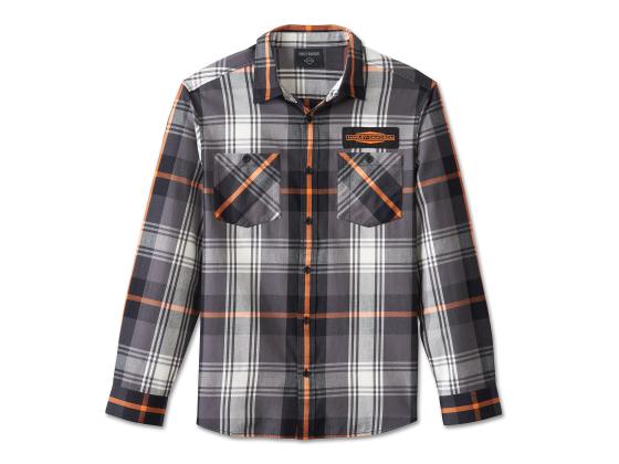 Our iconic colors merge with longwearing comfort on the Stacked Bar & Shield Long Sleeve Plaid Shirt. Made from durable yet lightweight cotton twill that's washed for softness and a well-worn feel. This men's button down features a shirttail hem that looks great tucked in or out, a pen stall on the chest pocket, and a hidden snap-down collar that stays put under riding gear. The plaid pattern is an ideal backdrop for the stacked Bar & Shield patches on both sides. Our featured logo here dates back to 1963 when it was extended horizontally to better fit our motorcycle gas tanks.