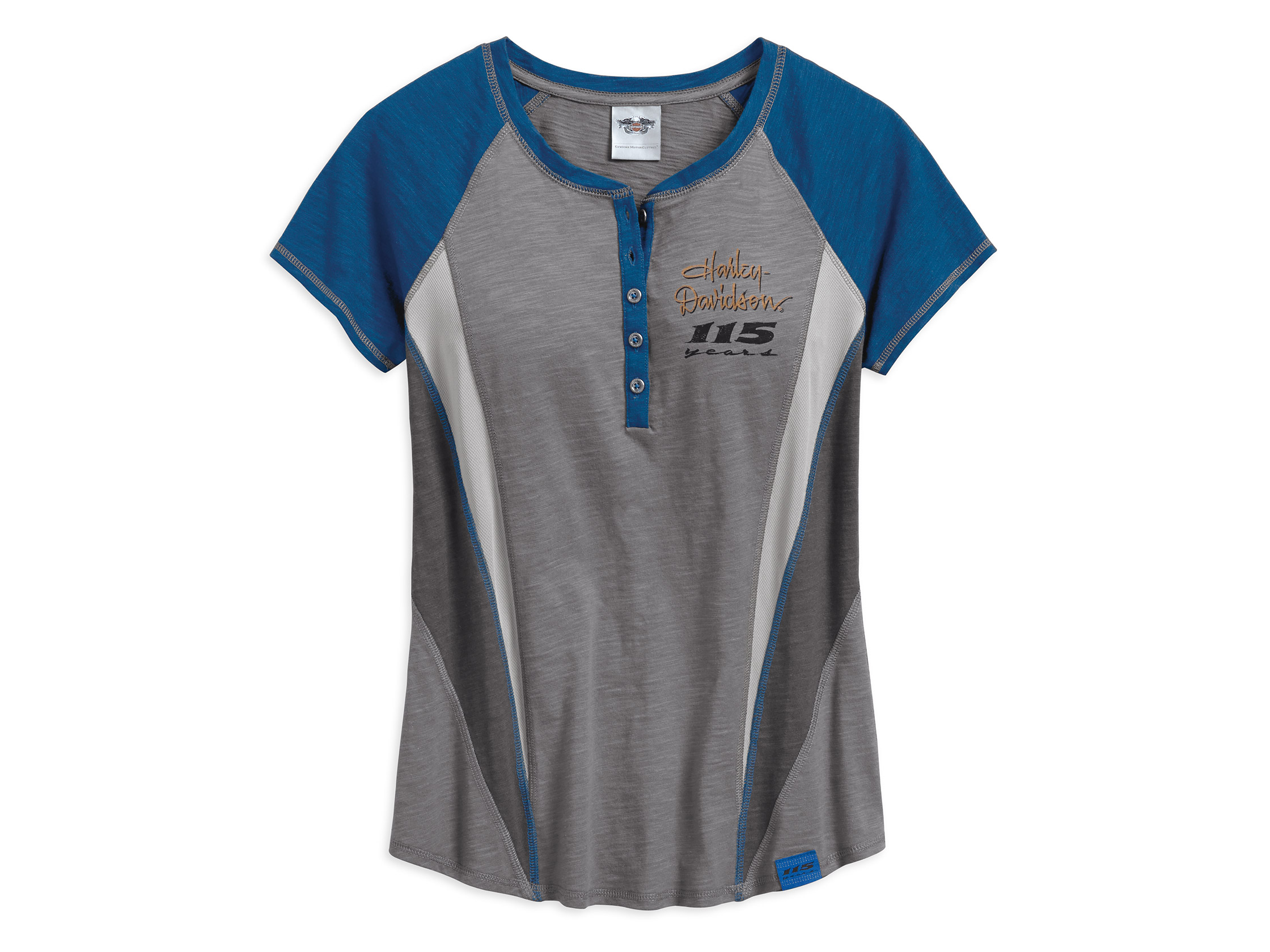 When you're not in the mood for a tank or tee, try our 115th Anniversary Mesh Inset Henley. It gets a sassy style boost courtesy of the mesh sides. Sporty contrasting details are abundant and the contoured seaming offers a super flattering silhouette. Undo a button or two on this women's short sleeve top and add your favorite choker or pendant necklace.