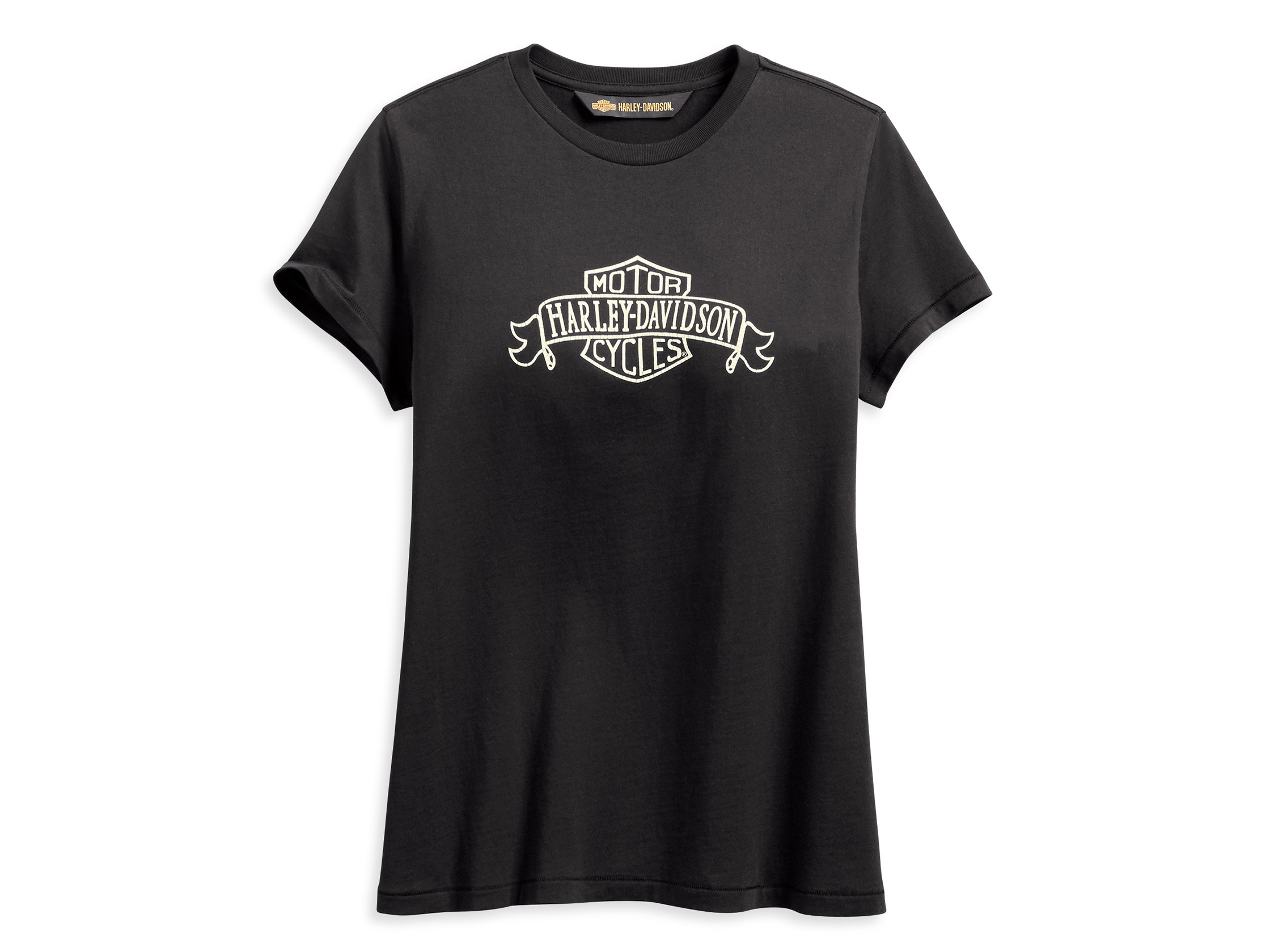 This classic black tee has a throwback look with cracked banner graphics in vintage-inspired type. For extra softness and a lived-in feel, the Banner Logo Tee is stonewashed. This all-cotton women's short sleeve top is ready to layer under a favorite plaid shirt. Materials: 100% cotton jersey.