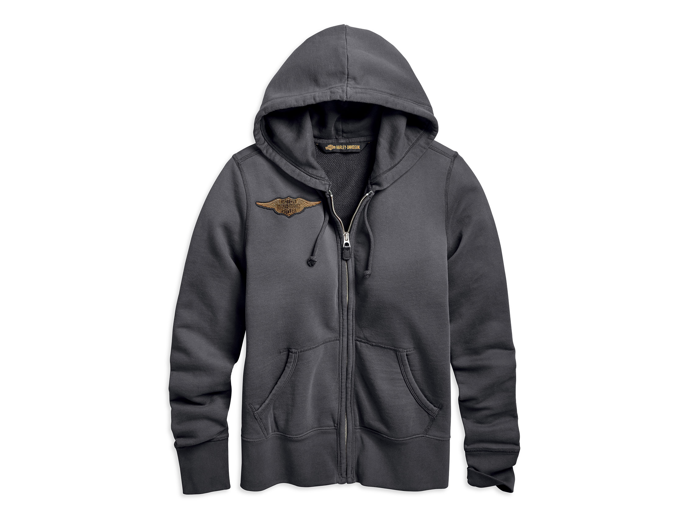 Materials: 100% cotton French terry. Design Details: Washed for softness. Garment dyed with pigment spray for washeddown look. Rib-knit cuffs and waist. Lined drawstring hood. Closure: Zipper front. Pockets: Kangaroo pockets. Graphics: Embroidered patch. Dirty two-layer felt appliqué lettering.