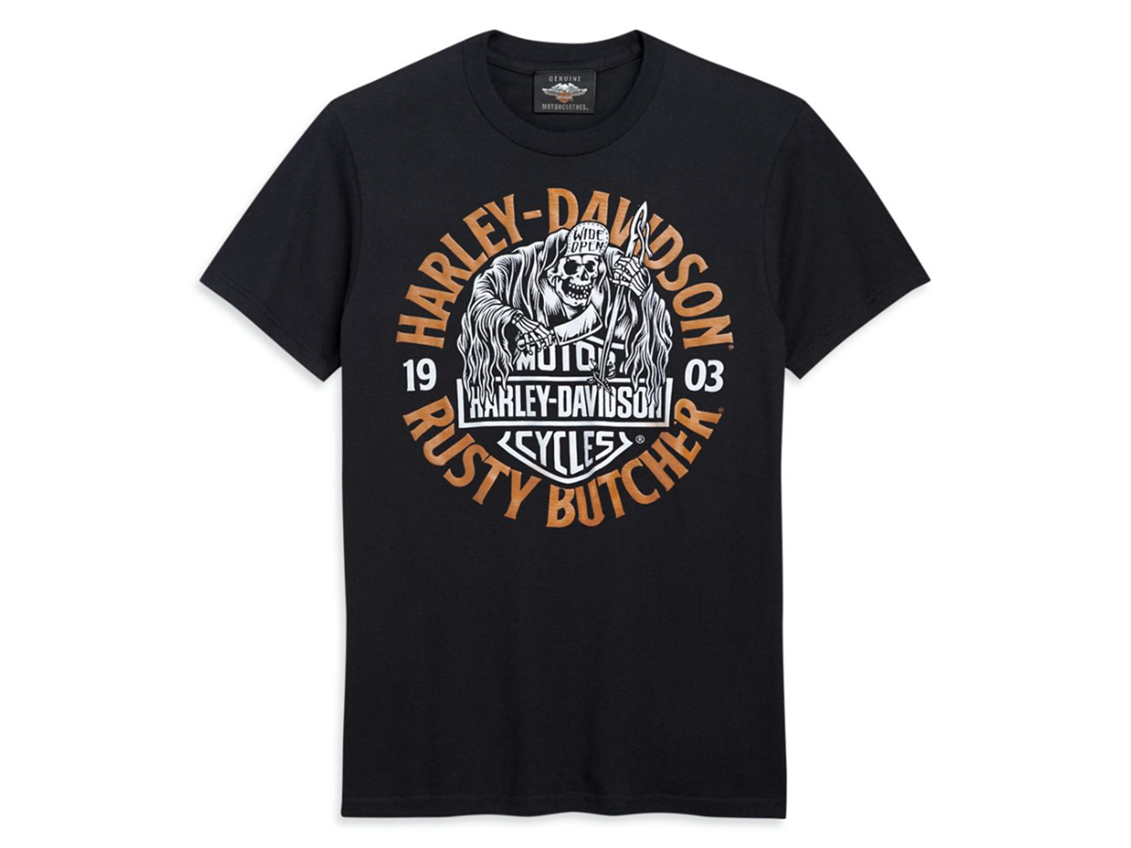 We're super proud to announce this special collaboration with Rusty Butcher. The H-D® x Rusty Butcher Wide Open Short Sleeve Tee is one of several original designs. Each is cut from hearty black cotton and printed with wicked-awesome art meant to capture the slightly twisted, live-fast attitude of the Rusty Butcher brand. This men's short sleeve shirt includes the skeleton armed with cleaver and needle so you know it's legit. Materials: 100% cotton.
