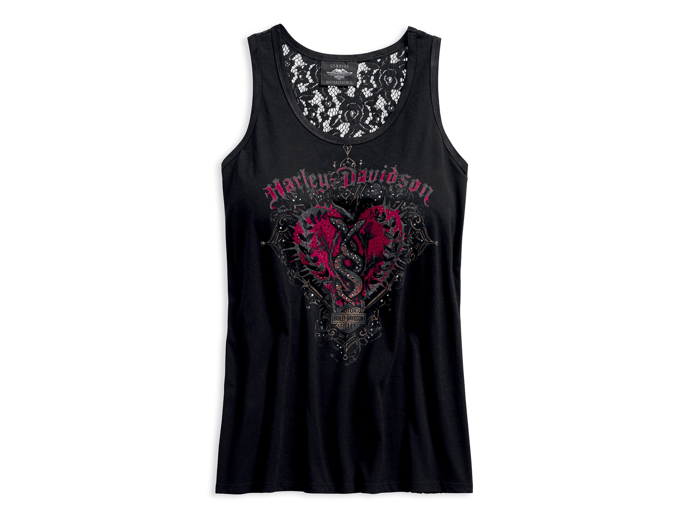 Material: 60% cotton, 40% modal jersey front. 92% nylon, 8% spandex lace back. Design Details: Suede-like neckline and armhole trim. Graphics: Flocked and printed graphics with rhinestone