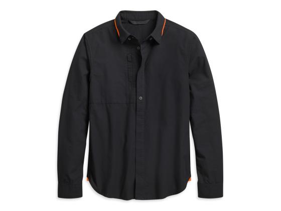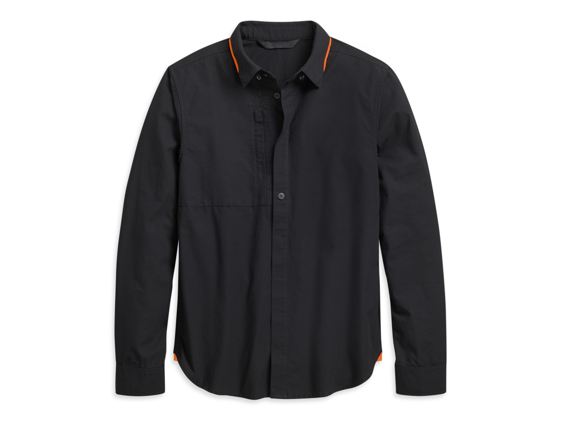 Cut from all-cotton jacquard with a subtle tonal texture, the Hidden Button Slim Fit Shirt transitions with ease from ride to relax. A kick of bold color at the side slits and collar gives this men's long sleeve shirt an edge. 100% cotton yarn-dyed jacquard is washed for softness.