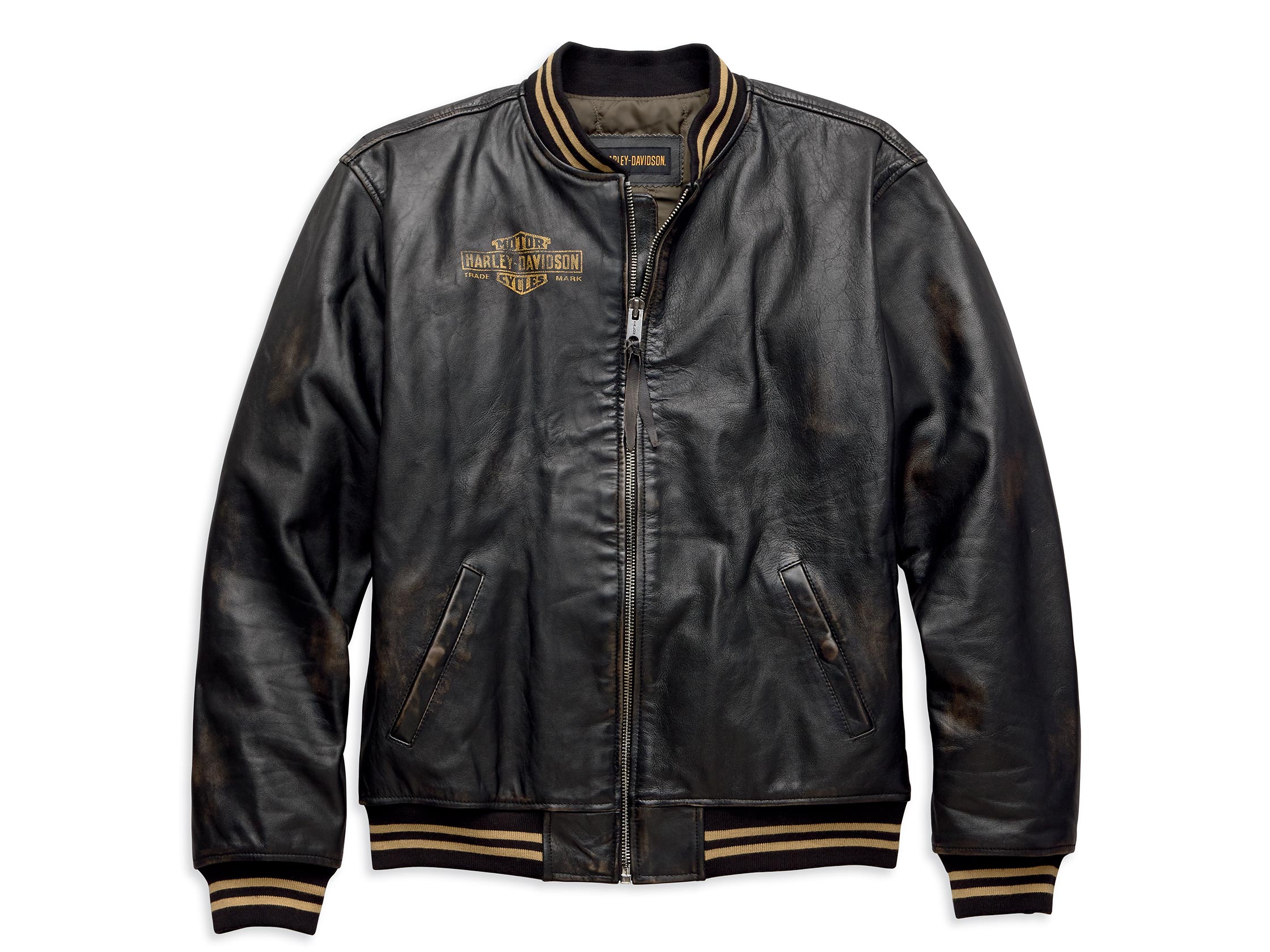 Midweight cowhide leather. Quilted nylon lining. Washed and waxed leather with rub-off finish for vintage look. Rib-knit collar, cuffs, and waist. Zipper front. Snap hand-warmer pockets. One interior stash pocket. Distressed printed graphics. Slim Fit- fits closer to the body.