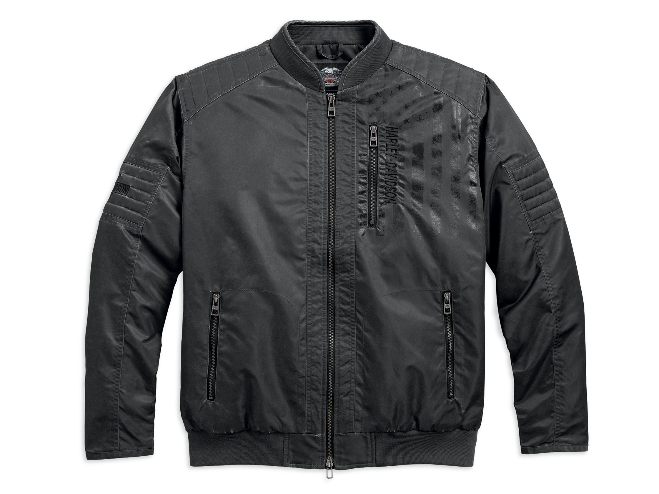 100% nylon twill is washed for faded, worn look. Polyester/cotton sheeting body lining and polyester twill sleeve lining. Underarm venting grommets and action back. Rib-knit collar and waist. Two zipper hand-warmer pockets and one zipper chest pocket. One horizontal interior pocket and one zipper vertical interior pocket. Printed graphics on lining and left chest. Embroidered graphics on right sleeve, left chest, and back.