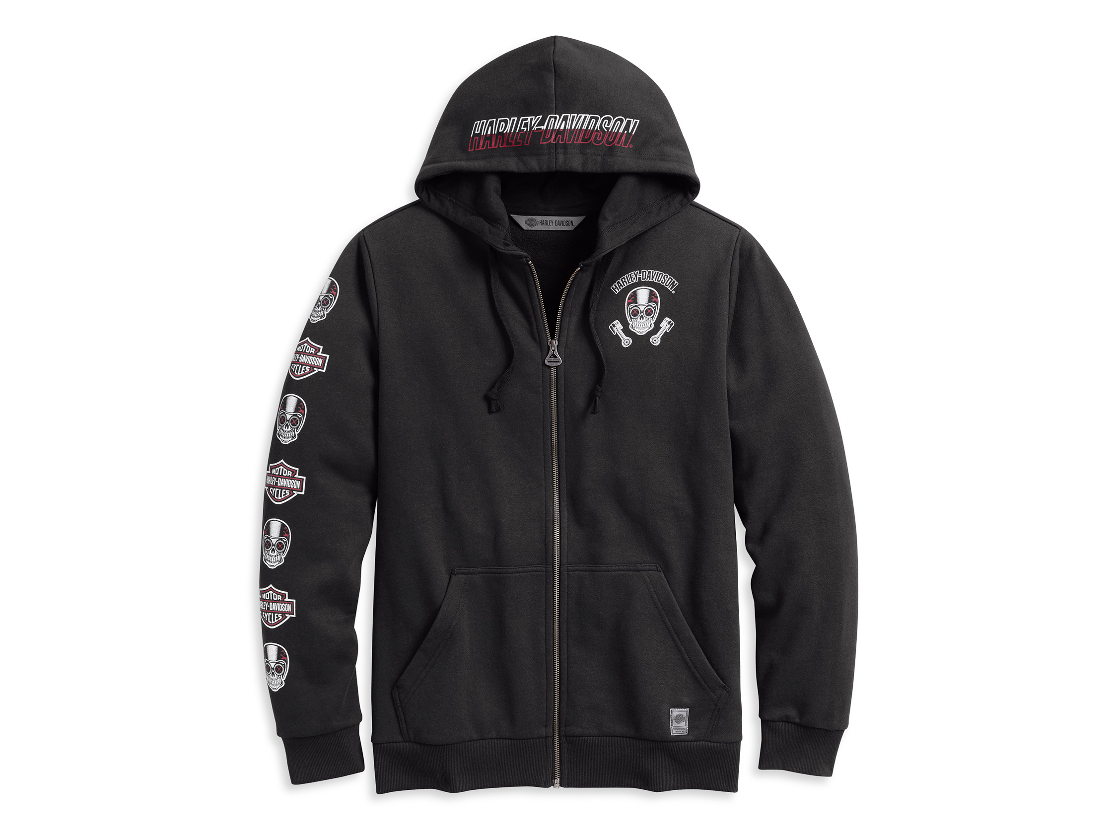 Why mess with a classic? The Skull & Logo Slim Fit Hoodie features timeless details of a men's hoodie including classic kangaroo-style pockets and rib-knit trim. But the art takes it to a new level. Rascally bike chain and skull graphics mark the chest and sleeve adding an air of mischief. Materials: 60% cotton, 40% polyester fleece.