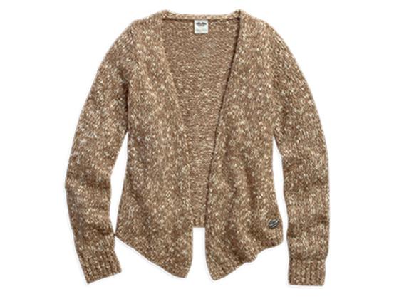 30% polyester, 29% acrylic, 23% nylon, 16% metallic, 1% angora, 1% wool jersey. V-neck with drawstring hood. Knit-in sequins. Metal badge on front left hem. Embroidered graphics on hood.