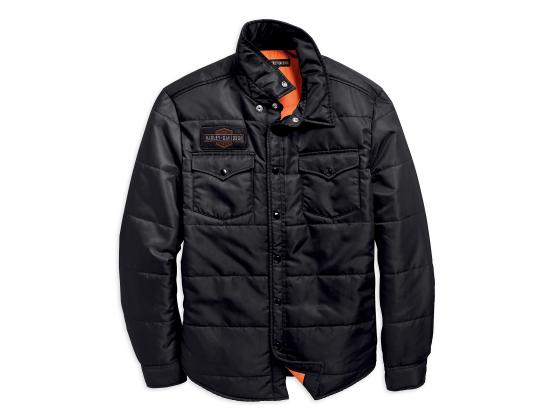 Stay Warm: Quilted for warmth. Materials: 100% nylon twill. Nylon lining. Design Details: Snap-down collar. Contrasting lining. Closure: Snap front and cuffs. Pockets: Snap hand-warmer and chest pockets. Graphics: Embroidered patch on chest. Oversized patch on back. Fit: Slim Fit—fits closer to the body.