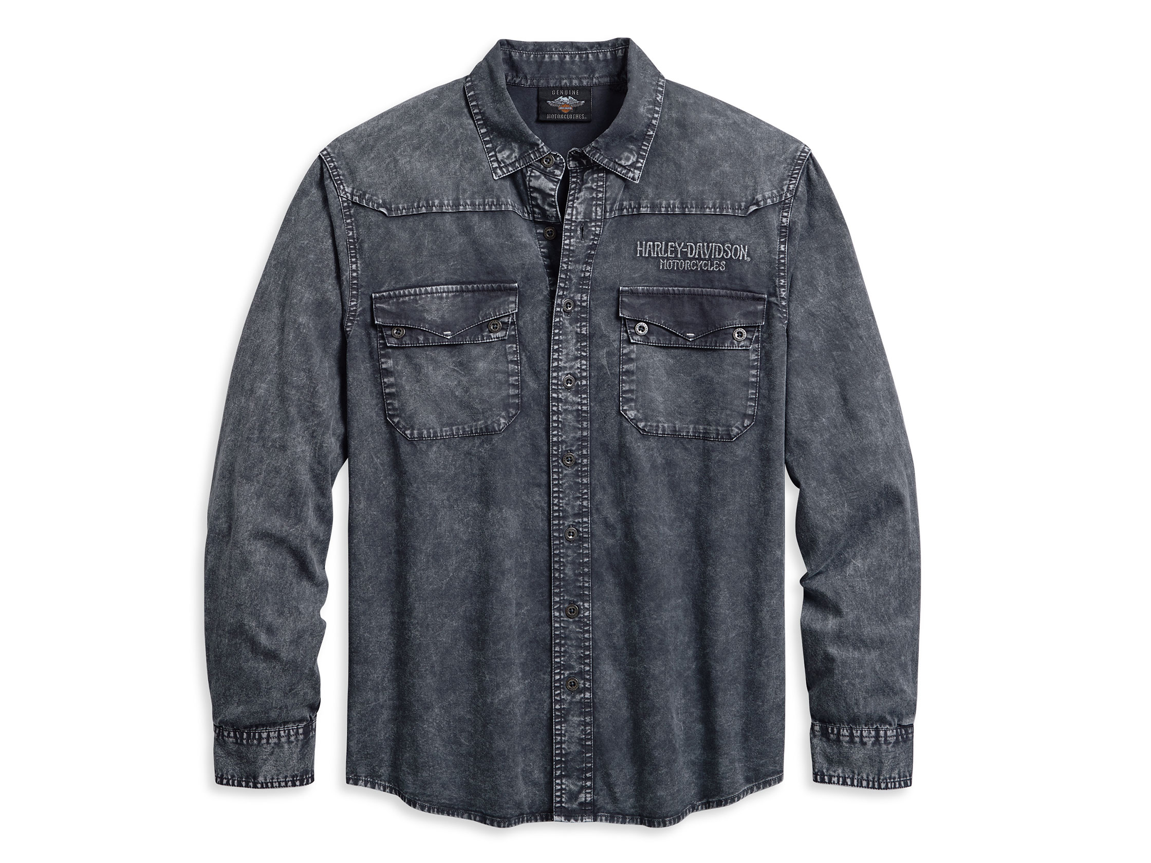 Proudly presenting the Serpent Skull Long Sleeve Shirt. Flip to the back for jaw-dropping original art certain to invite wide-eyed stares. Styled from rugged cotton twill, this men's long sleeve shirt boasts a washed look for a been-there-done-that vibe the very first wear. Awesome layered over a favorite graphic tee.