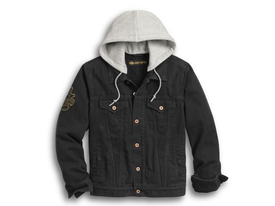 The Skull Flag Denim Jacket blends classic style with iconic symbols of motorcycle culture. For a vintage club feel, the oversized patch on the Skull Flag Denim Jacket is encircled in a chunky stitch to endure miles of wear. A snap-off hood gives this men's casual jacket a 2-in-1 layered look. A versatile piece in any season. 100% cotton broken twill.