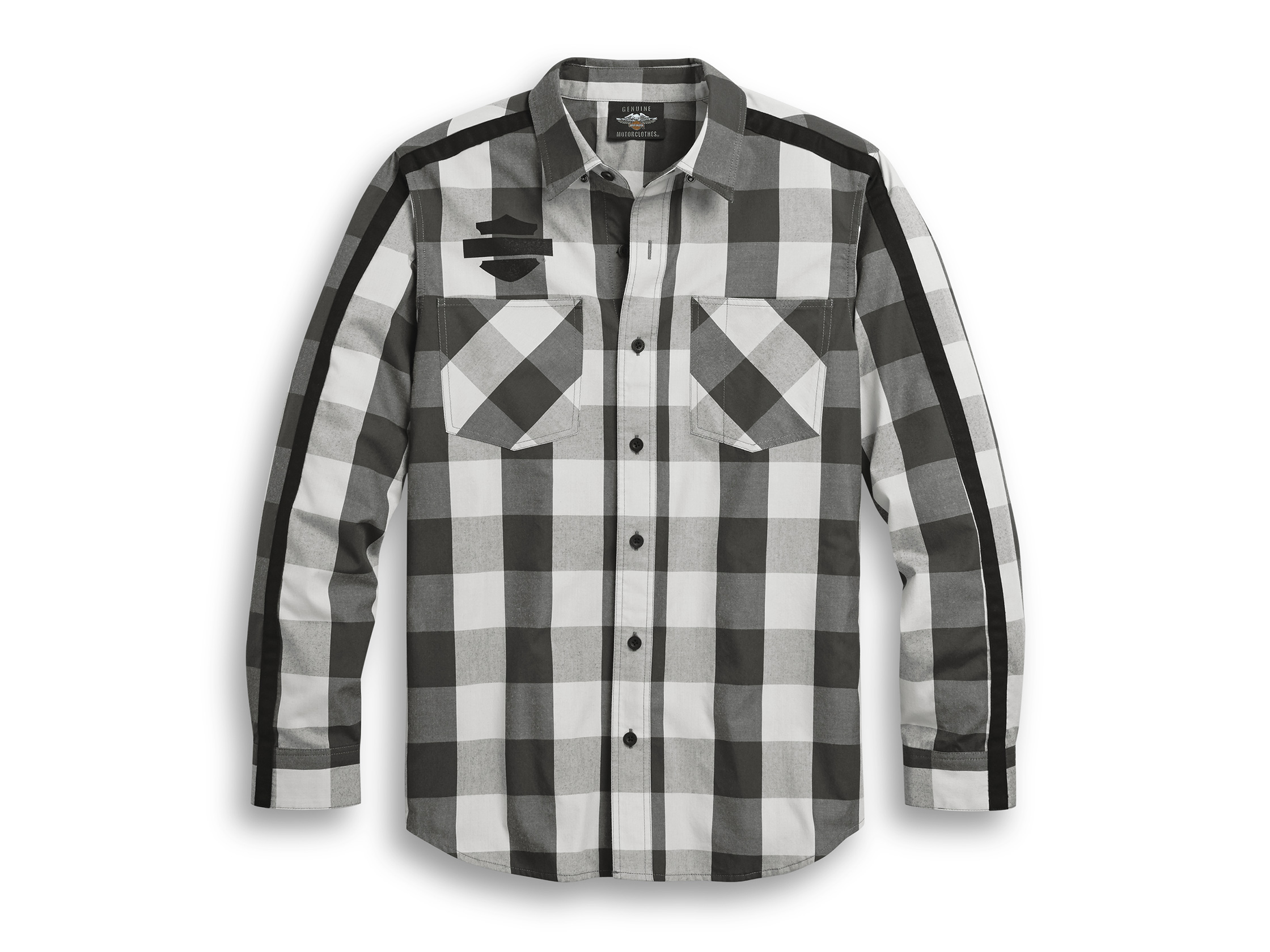 Lightweight with classic button-front style, the Sleeve Stripe Plaid Shirt is washed to be soft and ride ready. Buffalo plaid isn't REVOLUTION"®ary, but it's how we style it that matters. Check the sleeves… appliqué stripes accent this men's long sleeve shirt. Go with khakis M-F then jeans on the weekends. 60% cotton, 40% polyester yarn-dyed plaid is washed for softness.