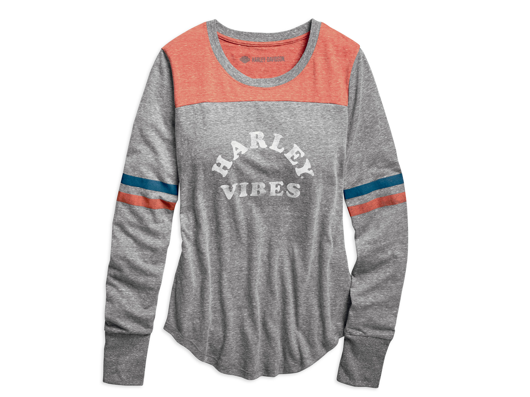 The sporty Harley® Vibes Varsity Tee is all about miles of good times on the open road. This women's long sleeve top is styled from soft tri-blend fabric with a heathered, '70s look. Rounded hem and distressed art make this one versatile for both distressed jeans and comfy joggers. Materials: 50% polyester 38% cotton 12% tri-blend jersey.