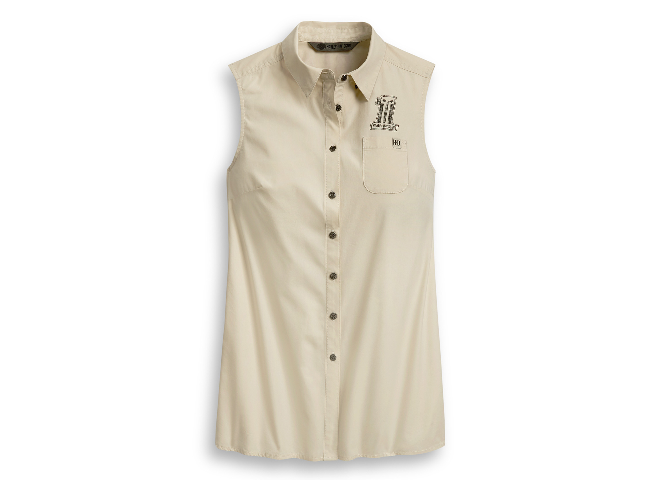 Tie-front shirts are the look this season. We serve up our #1 Skull Tie-Front Shirt with playful tie and vintage style. Inspired by work coveralls, this lightweight women's sleeveless top features retro chain stitched needlework on back. Tie front not your thing? No problem. It looks just as awesome worn untied. Materials: 100% cotton poplin is washed for softness.