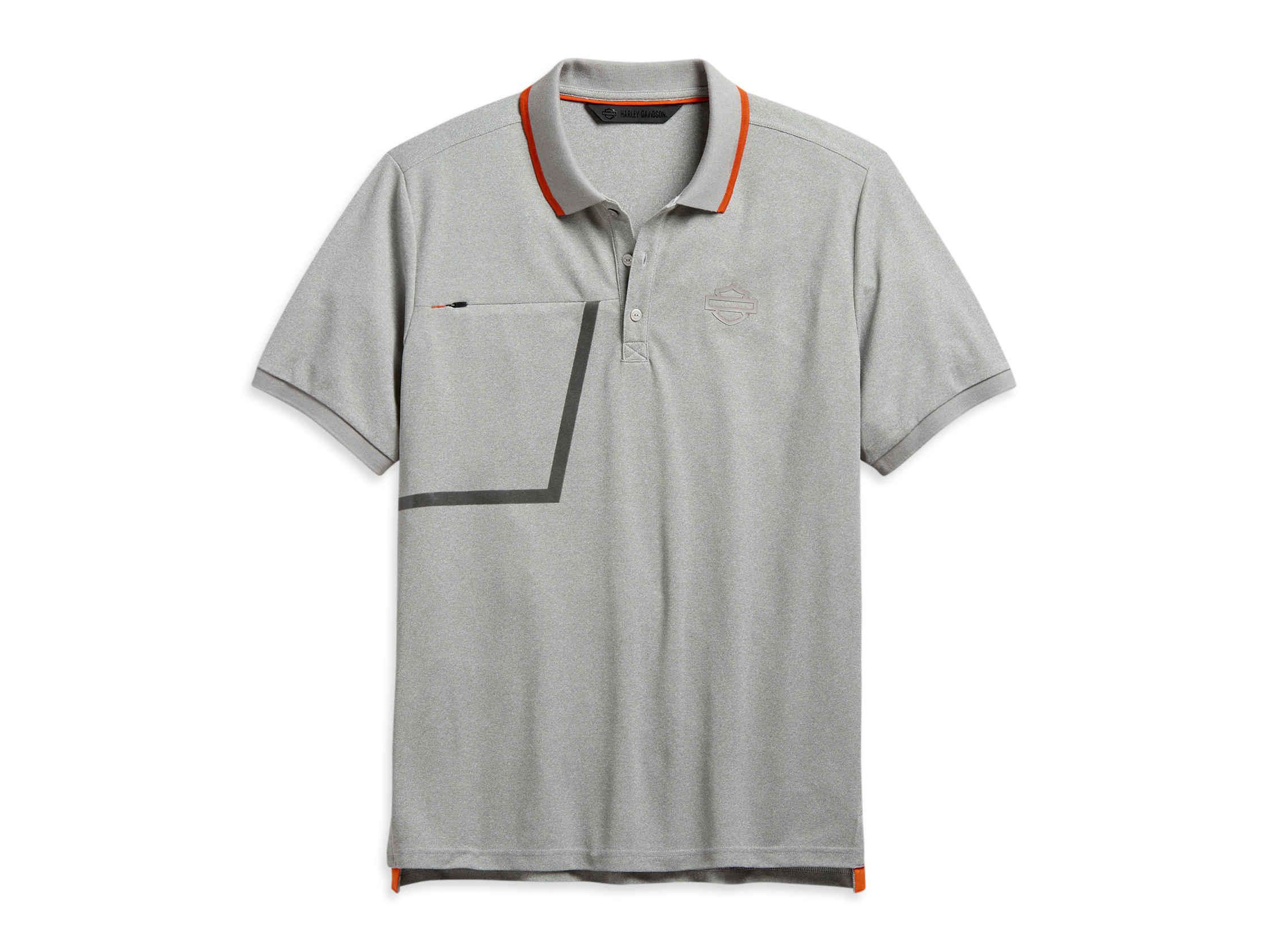 A sleek hidden chest pocket and tipped collar upgrade this men's short sleeve shirt from sporty polo to stylish layer. Understated graphics on smooth, soft piqué keep the Zipper Pocket Slim Fit Polo a low-key piece. 100% polyester piqué.
