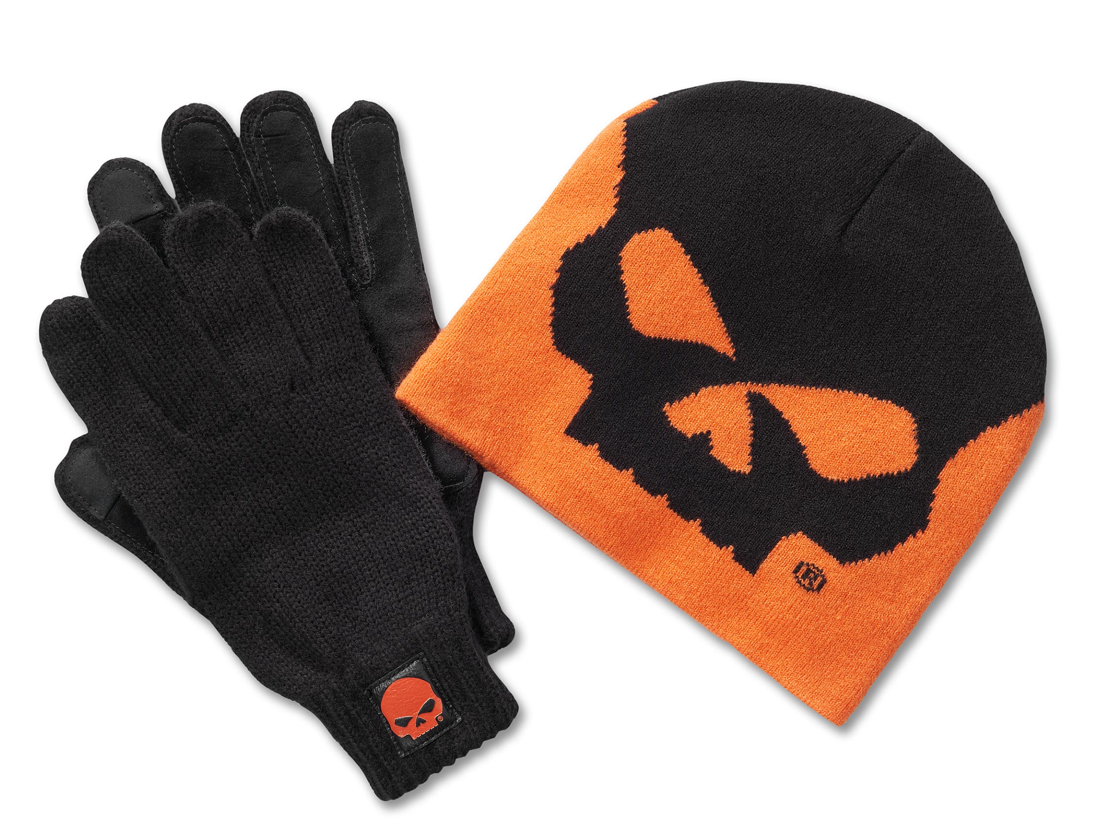 Stay warm in a style that honors a creative legacy with the Limited-Edition Willie G" Skull Beanie and Glove Gift Set. The beanie is made from acrylic knit with a hit of spandex for added stretch. The touchscreen-compatible gloves are a mix of acrylic/spandex knit with a goat leather palm. Willie G. Davidson's iconic skull graphic gets a pop of bold color for a look that honors the work of our brand's chief styling officer. Know the history—in addition to graphics, Willie G. designed several H-D® motorcycles, including the 1971 FX Super Glide® and the 1977 FXS Low Rider®. Order this set now while supplies last.